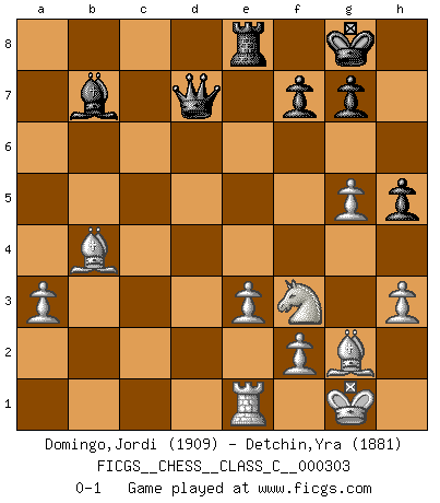 Last move : 0-1 2022 December 18 16:31:22 [Event "FICGS__CHESS__CLASS_C__000303"] [Site "FICGS"] [Date "2022.08.06"] [Round "1"] [White "Domingo,Jordi"] [Black "Detchin,Yra"] [Result "0-1"] [WhiteElo "1909"] [BlackElo "1881"] 1.g4 d5 2.h3 h5 3.g5 e5 4.Bg2 Nc6 5.d4 exd4 6.Nf3 Bc5 7.a3 Nge7 8.b4 Bd6 9.b5 Ne5 10.Qxd4 c5 11.bxc6 N7xc6 12.Qxd5 Be6 13.Qb5 a6 14.Qxb7 Rb8 15.Qxa6 Bc4 16.Nxe5 Bxa6 17.Nxc6 Qc8 18.Nxb8 Bxb8 19.Nd2 Qxc2 20.O-O O-O 21.Rb1 Bf4 22.Rb2 Qc7 23.Re1 Re8 24.e3 Be5 25.Nf3 Bc3 26.Rd2 Bxd2 27.Bxd2 Bb7 28.Bb4 Qd7 0-1 Follow this game move after move (download)By the beauty of his games, the clarity of his play, and the brilliance of his ideas, Fischer made himself an artist of the same stature as Brahms, Rembrandt, and Shakespeare. (David Levy) Ohne Leiden bildet sich kein Charakter. (Ernst Freiherr von Feuchtersleben) El Ajedrez hace al hombre ser mas sabio y ver mas claro. (Vladimir Putin) En blitz, le Cavalier l'emporte sur le Fou. (Vlastimil Hort) He who laughs last probably does not get the joke. (Unknown)