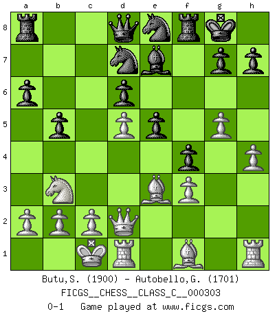 Last move : 0-1 2023 January 10 23:53:45 [Event "FICGS__CHESS__CLASS_C__000303"] [Site "FICGS"] [Date "2022.08.06"] [Round "1"] [White "Butu,Sebastian"] [Black "Autobello,Giovanni"] [Result "0-1"] [WhiteElo "1900"] [BlackElo "1701"] 1.e4 c5 2.Nf3 d6 3.d4 cxd4 4.Nxd4 Nf6 5.Nc3 a6 6.Be3 e5 7.Nb3 Be6 8.Qd2 Be7 9.f3 O-O 10.O-O-O Nbd7 11.g4 b5 12.g5 Ne8 13.Nd5 Bxd5 14.exd5 f5 15.h4 f4 0-1 This chess game has been lost on time (started : 2022.08.06 19:28:18) Follow this game move after move (download)I have added these principles to the law: get the Knights into action before both Bishops are developed. (Emanuel Lasker) Schach ist ein Reich, wo sich die menschliche Phantasie frei entfalten kann. (David Bronstein) El Ajedrez demanda una total concentración. (Bobby Fischer) Les échecs sont un jeu terrible. Si vous n'avez pas le centre, votre adversaire a une position plus libre. Par contre, si vous avez le centre, alors vous avez vraiment quelque chose pour laquelle vous inquiéter ! (Siegbert Tarrasch) Wisdom is the reward you get for a lifetime of listening when you'd have preferred to talk. (Doug Larson)
