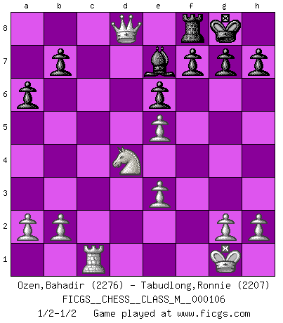 Last move : 1/2-1/2 2022 September 17 17:50:31 [Event "FICGS__CHESS__CLASS_M__000106"] [Site "FICGS"] [Date "2022.08.07"] [Round "1"] [White "Ozen,Bahadir"] [Black "Tabudlong,Ronnie"] [Result "1/2-1/2"] [WhiteElo "2276"] [BlackElo "2207"] 1.e4 c6 2.d4 d5 3.e5 Bf5 4.Nf3 e6 5.Be2 c5 6.Be3 cxd4 7.Nxd4 Ne7 8.Nd2 Nbc6 9.N2f3 Be4 10.O-O a6 11.Rc1 Rc8 12.c4 Nxd4 13.Nxd4 dxc4 14.Bxc4 Bd5 15.Qe2 Bxc4 16.Rxc4 Rxc4 17.Qxc4 Nd5 18.Rc1 Be7 19.Qc8 Nxe3 20.fxe3 O-O 21.Qxd8 1/2-1/2 Follow this game move after move (download)Chess holds its master in its own bonds, shackling the mind and brain so that the inner freedom of the very strongest must suffer. (Albert Einstein) Intelligenz läßt sich nicht am Weg, sondern nur am Ergebnis feststellen. (Garry Kasparov) Si tu oponente no puede hacer nada activo, entonces no apures la posición; En vez de eso, dejalo estar sentado ahí, sufriendo y rogandote por un empate. (Jeremy Silman) Tout change constamment, y compris dans le monde des Echecs. (Botvinnik) The quality of decision is like the well-timed swoop of a falcon which enables it to strike and destroy its victim. (Sun Tzu)