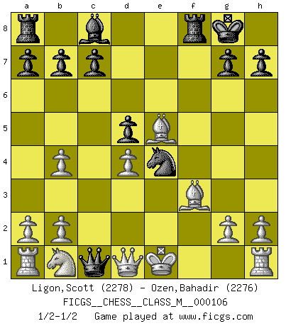Last move : 1/2-1/2 2022 August 30 13:23:58 [Event "FICGS__CHESS__CLASS_M__000106"] [Site "FICGS"] [Date "2022.08.07"] [Round "1"] [White "Ligon,Scott"] [Black "Ozen,Bahadir"] [Result "1/2-1/2"] [WhiteElo "2278"] [BlackElo "2276"] 1.e4 e5 2.f4 exf4 3.Bc4 Nc6 4.d4 Nf6 5.e5 d5 6.Be2 Ne4 7.Bxf4 f6 8.Nf3 fxe5 9.Nxe5 Nxe5 10.Bxe5 Bb4+ 11.c3 Qg5 12.cxb4 O-O 13.Bf3 Qe3+ 14.Qe2 Qc1+ 15.Qd1 1/2-1/2 Follow this game move after move (download)Any material change in a position must come about by mate, a capture, or a Pawn promotion. (Purdy) Die meiste Zeit treffe ich auf Gegner, die meine Enkel sein könnten. Ich bin da, um ihnen zu zeigen, dass sie von mir noch einiges lernen können. (Viktor Kortschnoi) Algunos sacrificios son sólidos, los demás son míos. (Mikhail Tal) D'abord les bases : Jouez et étudiez, puis étudiez et jouez, ensuite jouez et étudiez, puis étudiez et jouez. Deuxièmement : Donnez toujours le meilleur de vous-même ! (Ken Smith) Internal peace cannot coexist with external war. (Don Groves)