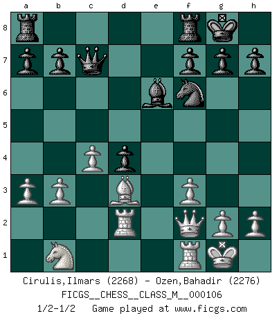 Last move : 1/2-1/2 2022 September 17 20:38:45 [Event "FICGS__CHESS__CLASS_M__000106"] [Site "FICGS"] [Date "2022.08.07"] [Round "1"] [White "Cirulis,Ilmars"] [Black "Ozen,Bahadir"] [Result "1/2-1/2"] [WhiteElo "2268"] [BlackElo "2276"] 1.d4 d5 2.c4 c6 3.Nf3 Nf6 4.e3 e6 5.b3 c5 6.Bb2 cxd4 7.Nxd4 e5 8.Nf3 Nc6 9.a3 d4 10.exd4 Nxd4 11.Be2 Bc5 12.Nxd4 Bxd4 13.Bxd4 exd4 14.O-O O-O 15.Ra2 Bf5 16.Rd2 Qe7 17.Bd3 Bg4 18.Qe1 Qc7 19.f3 Be6 20.Qf2 1/2-1/2 Follow this game move after move (download)The mistakes are there, waiting to be made. (Savielly Tartakower) Frage des Reporters: -Welche besonderen Umstände rechtfertigen das Anhalten der Uhren während einer Turnierpartie? Antwort: -Einen Fotographen zu strangulieren. (Siegbert Tarrasch) Un Peón pasado aumenta su poder a medida de que el número de piezas en el tablero disminuye. (Capablanca) La tactique, c'est ce que vous faites quand il y a quelque chose à faire; la stratégie, c'est ce que vous faites quand il n'y a rien à faire. (Savielli Tartacower) If you are good, you will be assigned all the work. If you are really good, you will get out of it. (Dan Rotaru)