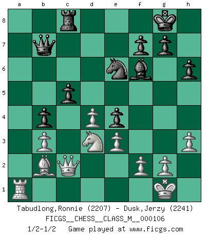 Last move : 1/2-1/2 2022 September 30 16:56:37 [Event "FICGS__CHESS__CLASS_M__000106"] [Site "FICGS"] [Date "2022.08.07"] [Round "1"] [White "Tabudlong,Ronnie"] [Black "Dusk,Jerzy"] [Result "1/2-1/2"] [WhiteElo "2207"] [BlackElo "2241"] 1.d4 Nf6 2.c4 e6 3.Nc3 Bb4 4.e3 O-O 5.Bd2 b6 6.Nf3 Bb7 7.Bd3 d5 8.cxd5 exd5 9.O-O Bd6 10.Qb1 a5 11.Nb5 Be7 12.h3 c6 13.Nc3 Nbd7 14.Qc2 h6 15.Rad1 Qc7 16.b3 Rfe8 17.Bc1 Ba6 18.Bxa6 Rxa6 19.Bb2 Qb7 20.Rc1 b5 21.Ne2 Ne4 22.Nf4 a4 23.Nd3 b4 24.Rfe1 axb3 25.axb3 Bf6 26.Nf4 Nf8 27.Nd3 Ne6 28.Ra1 Rxa1 29.Rxa1 Rc8 30.Nd2 c5 31.Nxe4 dxe4 1/2-1/2 Follow this game move after move (download)The Pin is mightier than the sword. (Fred Reinfeld) Ich tröste mich mit dem Vergnügen, daß Schachfans, Zuschauer und Leser glücklich sind, wenn ein Großmeister etwas riskiert, statt nur Klötzchen zu schieben. (Mikhail Nekhemyevich Tal) La caracteristica mas importante en la posición del Ajedrez es la actividad de las piezas. Esto es absolutamente fundamental en todas las fases del juego: Apertura, Juego Medio y especialmente Finales. La limitación primordial en la actividad de una pieza, es la estructuración de los Peones. (Michael Stean) Le pion, dans sa simplicité, marche droit devant lui, mais lorsqu'il prend, il le fait obliquement? Ainsi l'homme, tant qu'il reste pauvre, marche dans la droiture et vit honnêtement, mais lorsqu'il recherche les honneurs, il flatte, se parjure et, par les voies obliques, cherche une position supérieure sur l'échiquier du monde. (Jean de Galles) Everybody lies. (Gregory House, House M.D.)