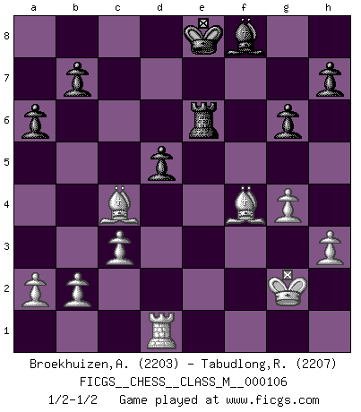 Last move : 1/2-1/2 2022 September 11 15:0:44 [Event "FICGS__CHESS__CLASS_M__000106"] [Site "FICGS"] [Date "2022.08.07"] [Round "1"] [White "Broekhuizen,A. T. S."] [Black "Tabudlong,Ronnie"] [Result "1/2-1/2"] [WhiteElo "2203"] [BlackElo "2207"] 1.e4 c6 2.d4 d5 3.e5 Bf5 4.Nf3 e6 5.c3 c5 6.Be2 Nc6 7.O-O cxd4 8.Nxd4 Nge7 9.Nxf5 Nxf5 10.Bd3 g6 11.Qe2 Bg7 12.f4 O-O 13.Nd2 f6 14.exf6 Qxf6 15.Nf3 Rae8 16.Kh1 a6 17.g4 Nd6 18.Bd2 e5 19.fxe5 Nxe5 20.Nxe5 Qxe5 21.Rxf8+ Bxf8 22.Qxe5 Rxe5 23.Bf4 Re6 24.h3 Kf7 25.Kg2 Ke8 26.Rd1 Nc4 27.Bxc4 1/2-1/2 Follow this game move after move (download)The laws of Chess do not permit a free choice: you have to move whether you like it or not. (Emanuel Lasker) Ein Großmeister muß tausende Partien in seinem Kopf speichern, denn diese sind für Ihn, was die Worte der Muttersprache für gewöhnliche Leute sind, oder Noten für Musiker... (Garry Kasparov) El Ajedrez es un cuento de Hadas de las 1001 metidas de pata. (Savielly Tartakower) Le génie consiste à savoir transgresser les règles au moment opportun. (Teichmann) The various flowers seem good to different people. (Chinese proverb)