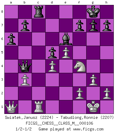 Last move : 1/2-1/2 2022 September 24 15:51:6 [Event "FICGS__CHESS__CLASS_M__000106"] [Site "FICGS"] [Date "2022.08.07"] [Round "1"] [White "Swiatek,Janusz"] [Black "Tabudlong,Ronnie"] [Result "1/2-1/2"] [WhiteElo "2224"] [BlackElo "2207"] 1.e4 c6 2.d4 d5 3.e5 Bf5 4.Nd2 e6 5.Ngf3 c5 6.Bb5+ Nd7 7.O-O a6 8.Bxd7+ Qxd7 9.Nh4 Nh6 10.Ndf3 Be4 11.Be3 Qb5 12.b3 Be7 13.Rc1 c4 14.Bg5 Qd7 15.g3 cxb3 16.axb3 Nf5 17.Nxf5 Bxf5 18.Bxe7 Qxe7 19.c4 O-O 20.cxd5 exd5 21.Nh4 Bh3 22.Ng2 Rfc8 23.Re1 Rxc1 24.Qxc1 Be6 25.Nf4 Rc8 26.Qa1 Qb4 27.Rc1 1/2-1/2 Follow this game move after move (download)In order to improve your game, you must study the endgame before everything else, for whereas the endings can be studied and mastered by themselves, the middle game and the opening must be studied in relation to the endgame. (Jose Raul Capablanca) Über Frauen: Chess is better. (Robert James Fischer) Un entendimiento minucioso de las típicas continuaciones de mate hacen de las mas complicadas combinaciones de sacrificio que conducen hacia ellas no solo no dificiles, sino casi un asunto de rutina. (Siegbert Tarrasch) Je ne crois pas en la psychologie, je crois aux bons coups. (Robert Fischer) A person who never made a mistake never tried anything new. (Albert Einstein)