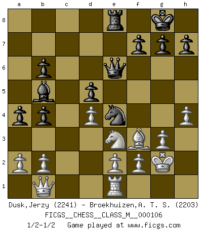 Last move : 1/2-1/2 2022 September 11 14:40:28 [Event "FICGS__CHESS__CLASS_M__000106"] [Site "FICGS"] [Date "2022.08.07"] [Round "1"] [White "Dusk,Jerzy"] [Black "Broekhuizen,A. T. S."] [Result "1/2-1/2"] [WhiteElo "2241"] [BlackElo "2203"] 1.d4 Nf6 2.c4 e6 3.Nf3 b6 4.g3 Bb7 5.Bg2 Bb4+ 6.Bd2 c5 7.Bxb4 cxb4 8.O-O O-O 9.Re1 d5 10.Nbd2 Qd6 11.Ne5 Nc6 12.cxd5 exd5 13.Ndf3 a5 14.h4 Ne4 15.Nxc6 Bxc6 16.Ne5 Bb5 17.Rc1 Rac8 18.Bf3 a4 19.Kg2 Qf6 20.Ng4 Qd6 21.Ne5 Qf6 22.Rxc8 Rxc8 23.Qb1 Qf5 24.Ng4 Re8 25.Ne3 Qe6 1/2-1/2 Follow this game move after move (download)Fischer is the strongest player in the world. In fact, the strongest player who ever lived. (Larry Evans) Wenn Du einsam bist, wenn Du Dich in der Welt wie ein Fremder fühlst, spiele Schach. Das wird Deinen Geist erheben und Dein Ratgeber im Kampf sein. (Aristoteles) Siempre es mucho mejor sacrificar las piezas de tu oponente. (Savielly Tartakover) La vérité est comme le meilleur coup aux échecs : elle existe, mais il faut la chercher. (Arturo Perez-Reverte) The right perception of any matter and a misunderstanding of the same matter do not wholly exclude each other. (Kafka's the trial)