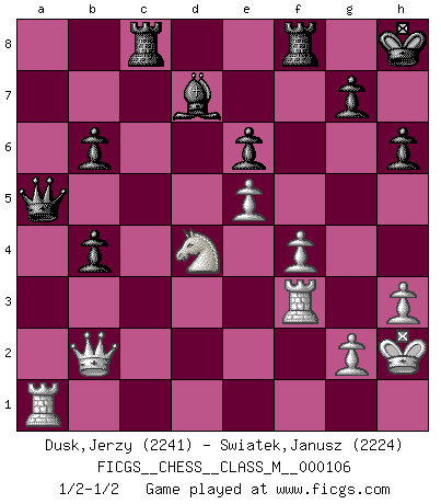 Last move : 1/2-1/2 2022 October 1 6:8:25 [Event "FICGS__CHESS__CLASS_M__000106"] [Site "FICGS"] [Date "2022.08.07"] [Round "1"] [White "Dusk,Jerzy"] [Black "Swiatek,Janusz"] [Result "1/2-1/2"] [WhiteElo "2241"] [BlackElo "2224"] 1.d4 Nf6 2.c4 e6 3.Nf3 d5 4.Nc3 c5 5.cxd5 Nxd5 6.e4 Nxc3 7.bxc3 cxd4 8.cxd4 Bb4+ 9.Bd2 Bxd2+ 10.Qxd2 O-O 11.Bc4 Nd7 12.O-O b6 13.Rfe1 Bb7 14.Rad1 Rc8 15.Bb3 h6 16.Re3 Qf6 17.Qe2 Qf4 18.d5 Nc5 19.Nd4 Nxb3 20.axb3 Rce8 21.h3 a6 22.Qb2 Qe5 23.Rf1 Bc8 24.b4 Bd7 25.f4 Qd6 26.dxe6 fxe6 27.e5 Qd5 28.Rf2 a5 29.Rd2 axb4 30.Rf3 Qa5 31.Kh2 Kh8 32.Rd1 Rc8 33.Ra1 1/2-1/2 Follow this game move after move (download)All I want to do, ever, is just play Chess. (Bobby Fischer) Es ist schade, dass viele Schachsportler vergessen, wie wichtig Auftreten und angemessene Kleidung sind. (Alexandra Kosteniuk) El Ajedrez es un regaderazo frío para la mente. (Sir John Simon) On a dit que l'homme se distingue de l'animal par le fait qu'il achète plus de livres qu'il ne peut en lire. Je voudrais suggérer qu'inclure à la liste des livres quelques livres d'échecs rendrait la distinction manifeste. (Edward Lasker) Do not put your faith in what statistics say until you have carefully considered what they do not say. (William W. Watt)