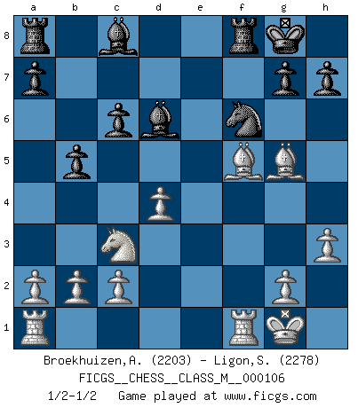 Last move : 1/2-1/2 2022 August 11 12:53:40 [Event "FICGS__CHESS__CLASS_M__000106"] [Site "FICGS"] [Date "2022.08.07"] [Round "1"] [White "Broekhuizen,A. T. S."] [Black "Ligon,Scott"] [Result "1/2-1/2"] [WhiteElo "2203"] [BlackElo "2278"] 1.e4 e5 2.Nf3 Nf6 3.Nxe5 Nxe4 4.Qe2 Qe7 5.Qxe4 d6 6.f4 f5 7.Qe3 dxe5 8.fxe5 Nc6 9.Nc3 Nxe5 10.d4 Ng4 11.Qxe7+ Bxe7 12.Bc4 c6 13.O-O b5 14.Bd3 O-O 15.h3 Nf6 16.Bg5 Bd6 17.Bxf5 1/2-1/2 Follow this game move after move (download)I won't play with you anymore. You have insulted my friend. - When an opponent cursed himself for a blunder. (Miguel Najdorf) Ich bin es gewohnt, das die Jugend mir überhaupt keinen Respekt entgegenbringt. (Alexander Morozewich) Las piezas de Ajedrez son los bloques del alfabeto que moldean los pensamientos; y esos pensamientos, aunque hagan un diseño visual en el tablero, expresan abstractamente su belleza como un poema. (Marcel Duchamp) Aux échecs, l'amour-propre est satisfait quand on remporte la victoire, mais il n'y a pas de honte à être battu. (Benjamin Franklin) Wikichess, chess moves explained by 'experimented' players. (Thibault de Vassal)