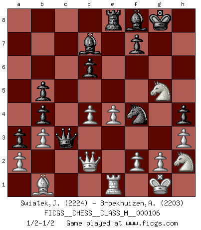 Last move : 1/2-1/2 2022 September 10 20:25:38 [Event "FICGS__CHESS__CLASS_M__000106"] [Site "FICGS"] [Date "2022.08.07"] [Round "1"] [White "Swiatek,Janusz"] [Black "Broekhuizen,A. T. S."] [Result "1/2-1/2"] [WhiteElo "2224"] [BlackElo "2203"] 1.e4 e5 2.Nf3 Nc6 3.Bb5 a6 4.Ba4 Nf6 5.O-O Be7 6.Re1 b5 7.Bb3 O-O 8.c3 d6 9.h3 h6 10.d4 Re8 11.Nbd2 Bd7 12.Nf1 a5 13.Bc2 Bf8 14.Ng3 a4 15.Be3 a3 16.b3 exd4 17.cxd4 Nb4 18.Bb1 c5 19.Bd2 Rc8 20.Bxb4 cxb4 21.Bd3 h5 22.Rc1 Rxc1 23.Qxc1 h4 24.Nf1 Nh5 25.N1h2 g5 26.Bb1 Nf4 27.Qd2 Qc7 28.Nxg5 Qc3 1/2-1/2 Follow this game move after move (download)Chess is played with the mind and not with the hands ! (Renaud and Kahn) Du kannst im Schach nur gut werden, wenn du das Spiel liebst. (Robert James Fischer) El juego del Ajedrez no es solamente una diversión quieta; algunas cualidades muy valuables de la mente se pueden adquirir y cultivar con el, como convertirlos en habitos disponibles para toda ocasión; ya que la vida es algo así como el Ajedrez. (Benjamin Franklin) Le plus grand jeu de l'esprit jamais inventé, plus vous l'apprenez, plus vous y prenez du plaisir. (Garry Kasparov) The real voyage of discovery consists not in seeking new lands but in seeing with new eyes. (Marcel Proust)