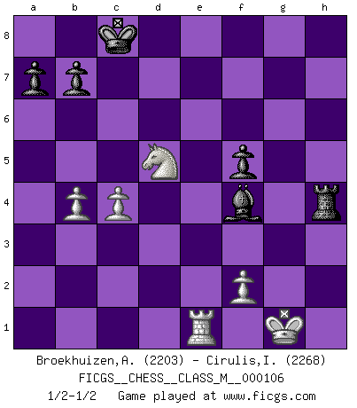 Last move : 1/2-1/2 2022 October 25 12:44:22 [Event "FICGS__CHESS__CLASS_M__000106"] [Site "FICGS"] [Date "2022.08.07"] [Round "1"] [White "Broekhuizen,A. T. S."] [Black "Cirulis,Ilmars"] [Result "1/2-1/2"] [WhiteElo "2203"] [BlackElo "2268"] 1.e4 e6 2.d4 d5 3.Nc3 Nf6 4.Bg5 dxe4 5.Nxe4 Nbd7 6.Nf3 h6 7.Nxf6+ Nxf6 8.Bh4 Be7 9.Bd3 c5 10.dxc5 Qa5+ 11.c3 Qxc5 12.Qe2 Bd6 13.O-O Bd7 14.Rad1 Ba4 15.b3 Bc6 16.Bxf6 gxf6 17.Be4 Bxe4 18.Qxe4 O-O-O 19.b4 Qh5 20.g3 Bc7 21.Qe3 f5 22.Kg2 e5 23.Rxd8+ Rxd8 24.Nxe5 f4 25.gxf4 f6 26.Qf3 Qe8 27.Ng4 Qg8 28.Kh1 Qxa2 29.Nxh6 Qc4 30.Re1 Qxf4 31.Qg4+ Kb8 32.Qxf4 Bxf4 33.Ng4 f5 34.Ne3 Rh8 35.c4 Rxh2+ 36.Kg1 Rh4 37.Nd5 Kc8 1/2-1/2 Follow this game move after move (download)The passed pawn is a criminal, who should be kept under lock and key. Mild measures, such as police surveillance, are not sufficient. (Nimzovitch) Ich verstehe den Grund nicht, warum die Aufteilung in Frauen und Männer überhaupt im Schach besteht. (Judith Polgar) El Ajedrez detiene a su maestro dentro de sus propios vínculos, encadenando la mente y el cerebro, por lo que la libertad interior del mas fuerte debe sufrir. (Albert Einstein) Si je n'étais pas joueur d'échecs, je serais le meilleur dans quelque chose d'autre. (Anatoli Karpov) Internet: Absolute communication, absolute isolation. (Paul Carvel)