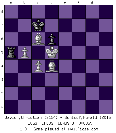 Last move : 1-0 2022 December 5 14:57:53 [Event "FICGS__CHESS__CLASS_B__000359"] [Site "FICGS"] [Date "2022.08.10"] [Round "1"] [White "Javier,Christian"] [Black "Schleef,Harald"] [Result "1-0"] [WhiteElo "2154"] [BlackElo "2016"] 1.e4 e5 2.Nf3 Nc6 3.Bb5 Bc5 4.c3 Bb6 5.d4 Nf6 6.Nxe5 Nxe5 7.dxe5 Nxe4 8.Qg4 Bxf2+ 9.Ke2 Qh4 10.Qxg7 Rf8 11.Bh6 Bc5 12.Nd2 Nf2 13.Rhe1 Qh5+ 14.Nf3 Ng4 15.Bg5 h6 16.Bh4 Qg6 17.Qxg6 fxg6 18.h3 g5 19.Bg3 a6 20.Ba4 Ne3 21.Bf2 Rf4 22.Bb3 Nxg2 23.Bxc5 d6 24.exd6 Nxe1 25.Rxe1 Re4+ 26.Be3 cxd6 27.Kd2 Bxh3 28.Rh1 O-O-O 29.Rxh3 g4 30.Rxh6 gxf3 31.Bd5 R4e8 32.Rh7 Rd7 33.Rh3 Rf8 34.Bxf3 Kc7 35.a4 R8f7 36.Bg4 Rde7 37.Rh8 b6 38.Ra8 Kb7 39.Rg8 Kc7 40.Bd4 Rf1 41.Kd3 Ref7 42.Be6 Re7 43.Bc4 Rf3+ 44.Kc2 b5 45.axb5 axb5 46.Bxb5 Rh3 47.Kb3 Rh5 48.Kb4 Rh2 49.b3 Reh7 50.Ra8 Kb7 51.Ra7+ Kb8 52.Ra6 R7h6 53.Bc6 Kc7 54.Kc4 Rb2 55.b4 R6h2 56.b5 Ra2 57.Rxa2 Rxa2 58.Kd5 Ra5 59.c4 1-0 Follow this game move after move (download)A thorough understanding of the typical mating continuations makes the most complicated sacrificial combinations leading up to them not only not difficult, but almost a matter of course. (Siegbert Tarrasch) Zu meiner Zeit war ein 20 jähriger ein junger Spieler, heute ist er ein Veteran. (Garry Kasparov) El Ajedrez, como cualquier otra actividad creativa, puede existir solo a través de méritos combinados de aquellos que tienen talento creativo y de aquellos que tienen la habilidad de organizar un trabajo creativo. (Mikhail Botvinnik) Le thème de l'attaque double intervient d'une manière ou d'une autre dans l'immense majorité des combinaisons. (Youri Averbakh) Mac users swear by their computers. PC users swear at their computers. (Author unknown)