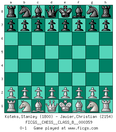 Last move : 0-1 2022 September 20 0:1:8 [Event "FICGS__CHESS__CLASS_B__000359"] [Site "FICGS"] [Date "2022.08.10"] [Round "1"] [White "Koteks,Stanley"] [Black "Javier,Christian"] [Result "0-1"] [WhiteElo "1800"] [BlackElo "2154"] 0-1 This chess game has been lost on time (started : 2022.08.10 20:9:55) Follow this game move after move (download)It began to feel as though you were playing against Chess itself. - On playing against Robert Fischer. (Walter Shipman) Wie, soll nun auch die Opposition abgeschafft werden? Ja, es tut mir leid, Ihnen diesen Schmerz nicht ersparen zu können. (Aaron Nimzowitsch) Cuando tu casa esta en llamas, no puedes ser molestado por tus vecinos. O, como decinos en Ajedrez, si tu Rey esta bajo ataque, no te preocupa perder un Peón del lado de la Reina. (Gary Kasparov) Il s'avisa de me proposer d'apprendre les échecs qu'il jouait un peu... me voilà forcené des échecs. J'achète un échiquier, je m'enferme dans ma chambre, j'y passe des jours et des nuits à vouloir apprendre par cur toutes les parties. (Jean-Jacques Rousseau, Confessions) Programming can only do so much before it becomes too much. (Don Groves)