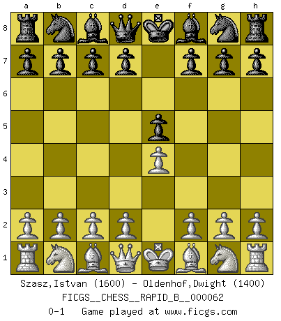 Last move : 0-1 2007 September 9 13:35:13 [Event "FICGS__CHESS__RAPID_B__000062"] [Site "FICGS"] [Date "2007.08.09"] [Round "1"] [White "Szasz,Istvan"] [Black "Oldenhof,Dwight"] [Result "0-1"] [WhiteElo "1600"] [BlackElo "1400"] 1.e4 e5 0-1 This chess game has been lost on time (started : 2007.08.09 6:54:57) King's pawn game Player Black won this chess game. Follow this game move after move (download)Different people feel differently about resigning. (Bobby Fischer) Ich habe die Schachforschung dermaßen betrieben, dass sie auf eine wissenschaftliche Basis gestellt wurde. (Mikhail Moiseyevich Botvinik) El Ajedrez no es una pizca de inferior al violín, y tenemos un gran número de violinistas profesionales. (Mikhail Botvinnik) La solitude du joueur d'Echecs à l'approche du mat est semblable à celle du condamné. (Francis Szpiner) Plans are ideas that never come to fruition. (Daniel Parmet)