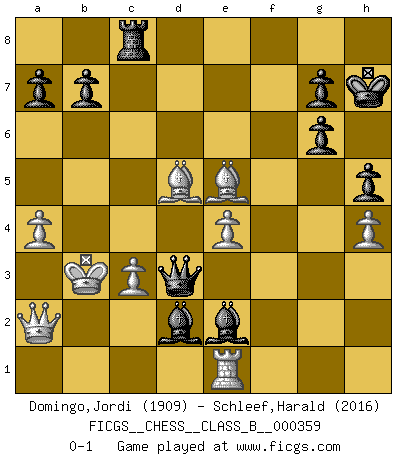 Last move : 0-1 2023 January 20 19:42:14 [Event "FICGS__CHESS__CLASS_B__000359"] [Site "FICGS"] [Date "2022.08.10"] [Round "1"] [White "Domingo,Jordi"] [Black "Schleef,Harald"] [Result "0-1"] [WhiteElo "1909"] [BlackElo "2016"] 1.g4 d5 2.h3 h5 3.g5 e5 4.Bg2 Nc6 5.d4 exd4 6.Nf3 Bc5 7.a3 Nge7 8.b4 Bb6 9.b5 Na5 10.Nxd4 c5 11.bxc6 Naxc6 12.c3 Ng6 13.Qb3 O-O 14.Be3 Be6 15.h4 Na5 16.Qc2 Bg4 17.Nd2 Qd7 18.Qa2 Rfd8 19.Qb2 Re8 20.Qa2 Re5 21.O-O-O Rc8 22.Kb2 Ne7 23.Rc1 Nf5 24.g6 fxg6 25.Bf4 Nxd4 26.Bxe5 Qb5+ 27.Ka1 Nab3+ 28.Nxb3 Nxb3+ 29.Kb2 Nxc1 30.Kxc1 Kh7 31.Bxd5 Bxf2 32.e4 Be3+ 33.Kc2 Bf3 34.Re1 Be2 35.a4 Qd3+ 36.Kb3 Bd2 0-1 Follow this game move after move (download)Fischer was a master of clarity and a king of artful positioning. His opponents would see where he was going but were powerless to stop him. (Bruce Pandolfini) Das Schachspiel hat wie die Liebe, die Musik, die Fähigkeit, den Menschen glücklich zu machen. Ich habe ein leises Gefühl des Bedauerns für jeden, der das Schachspiel nicht kennt, so wie ich jeden bedaure, der die Liebe nicht kennt. (Siegbert Tarrasch) El sobresalir en el Ajedrez es un signo de una mente intrigante. (Sir Arthur Conan Doyle) Toutes choses étant égales, c'est la conviction qui gagne. Alliée à une volonté de vaincre, elle sert de détonateur, suscite des idées, disperse les doutes et aide à penser clairement. (Robert Fischer) Knowledge rests not upon truth alone, but upon error also. (Carl G. Jung)
