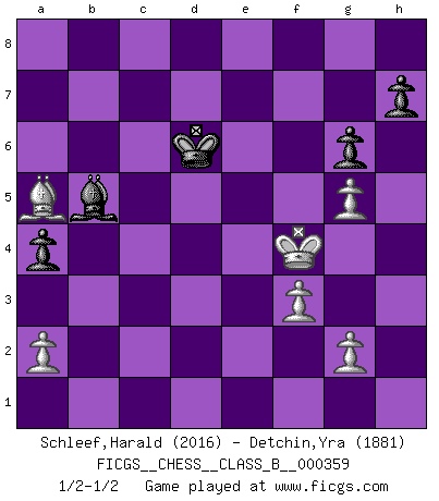 Last move : 1/2-1/2 2022 September 7 6:18:56 [Event "FICGS__CHESS__CLASS_B__000359"] [Site "FICGS"] [Date "2022.08.10"] [Round "1"] [White "Schleef,Harald"] [Black "Detchin,Yra"] [Result "1/2-1/2"] [WhiteElo "2016"] [BlackElo "1881"] 1.d4 Nf6 2.c4 e6 3.Nf3 b6 4.Nc3 Bb4 5.e3 Ne4 6.Qc2 Bb7 7.Bd3 f5 8.O-O Bxc3 9.bxc3 O-O 10.Nd2 Nxd2 11.Bxd2 Qf6 12.f3 c5 13.e4 cxd4 14.exf5 exf5 15.cxd4 Qxd4+ 16.Kh1 Na6 17.Rad1 Qf6 18.Rfe1 Nc5 19.Bc3 Qg5 20.Re5 Nxd3 21.Qxd3 Bc6 22.c5 b5 23.Rde1 Rf7 24.Qd4 Raf8 25.h4 Qg3 26.R1e2 Rf6 27.Be1 Qg6 28.Kh2 Qf7 29.Bc3 Qc4 30.Qxc4+ bxc4 31.Rd2 f4 32.Rd4 Bb5 33.Rg5 Rf5 34.Rxf4 Rxg5 35.Rxf8+ Kxf8 36.hxg5 Kf7 37.Kg3 g6 38.Kf4 d6 39.cxd6 Ke6 40.Bb4 c3 41.Bxc3 Kxd6 42.Bd4 a5 43.Bc3 a4 44.Ba5 1/2-1/2 Follow this game move after move (download)Chess is 99 percent tactics. (Teichmann) Ein Gewinn durch eine ungenaue Kombination, sei sie auch noch so vorzeigbar, erfüllt mich mit Schaudern. (Wilhelm Steinitz) No hay otro maestro que tenga una voluntad terrífica de ganar. Al tablero, el irradía peligro y aún los oponentes mas fuertes tienden a congelarse como liebres cuando olfatean a una pantera. Aún sus debilidades son peligrosas. Con las blancas, su juego de apertura es predecible - te es posible hacer planes en su contra - pero es tan fuerte que tus planes casi nunca funcionan. En el juego medio, su precisión e invención son fabulosas y en finales, tú simplemente no le puedes vencer. (Experto Alemán anónimo) La vérité est comme le meilleur coup aux échecs : elle existe, mais il faut la chercher. (Arturo Perez-Reverte) Either move or be moved. (Ezra Pound)