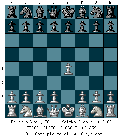 Last move : 1-0 2022 September 21 1:55:6 [Event "FICGS__CHESS__CLASS_B__000359"] [Site "FICGS"] [Date "2022.08.10"] [Round "1"] [White "Detchin,Yra"] [Black "Koteks,Stanley"] [Result "1-0"] [WhiteElo "1881"] [BlackElo "1800"] 1.e4 1-0 This chess game has been lost on time (started : 2022.08.10 20:9:55) Follow this game move after move (download)Though most people love to look at the games of the great attacking masters, some of the most successful players in history have been the quiet positional players. They slowly grind you down by taking away your space, tying up your pieces, and leaving you with virtually nothing to do ! (Yasser Seirawan) Kein Schachspieler kann gut schlafen. (H. G. Wells) En la vida, como en el Ajedrez, los Peones propios obstruyen nuestro camino. La gran fortuna de un hombre, su comodidad, placer, hijos, libros, que deberían ayudarle a ganar, con mucha frecuencia lo ponen en Jaque Mate. (Charles Buxton) Les échecs sont un jeu terrible. Si vous n'avez pas le centre, votre adversaire a une position plus libre. Par contre, si vous avez le centre, alors vous avez vraiment quelque chose pour laquelle vous inquiéter ! (Siegbert Tarrasch) Without enthusiasm, virtue functions not at all, and vice only poorly. (Mignon McLaughlin, The Neurotic's Notebook, 1960)