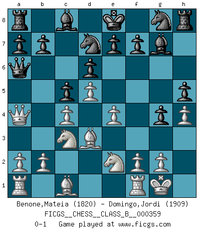 Last move : 0-1 2022 December 5 14:42:32 [Event "FICGS__CHESS__CLASS_B__000359"] [Site "FICGS"] [Date "2022.08.10"] [Round "1"] [White "Benone,Mateia"] [Black "Domingo,Jordi"] [Result "0-1"] [WhiteElo "1820"] [BlackElo "1909"] 1.d4 h6 2.e4 c5 3.d5 d6 4.c4 g5 5.Nc3 Bg7 6.h4 g4 7.Bd3 h5 8.Nge2 Nd7 9.Qa4 Qb6 10.O-O Qa6 0-1 This chess game has been lost on time (started : 2022.08.10 20:9:55) Follow this game move after move (download)My style is somewhere between that of Tal and Petrosian. (Reshevsky) Ich hatte Zahnschmerzen im ersten Spiel. In der zweiten Partie tat mir der Kopf weh. In der dritten war es eine Rheuma-Attacke und während der vierten fühlte ich mich nicht gut. Und in der fünften? Nun, man muss doch nicht jedes Spiel gewinnen, oder? (Savielly Grigorievitsch Tartakower) El Ajedrez es un cuento de Hadas de las 1001 metidas de pata. (Savielly Tartakower) Si je n'étais pas joueur d'échecs, je serais le meilleur dans quelque chose d'autre. (Anatoli Karpov) You can think I'm wrong, but that's no reason to quit thinking. (Gregory House, House M.D.)