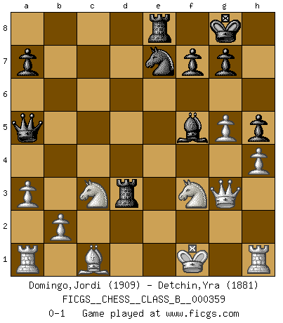 Last move : 0-1 2023 January 26 18:55:42 [Event "FICGS__CHESS__CLASS_B__000359"] [Site "FICGS"] [Date "2022.08.10"] [Round "1"] [White "Domingo,Jordi"] [Black "Detchin,Yra"] [Result "0-1"] [WhiteElo "1909"] [BlackElo "1881"] 1.g4 d5 2.Bg2 c6 3.h3 h5 4.g5 e5 5.d4 e4 6.c4 Bd6 7.Nc3 Ne7 8.h4 b5 9.cxd5 cxd5 10.Nxb5 Qa5+ 11.Nc3 O-O 12.f3 Nbc6 13.fxe4 dxe4 14.Bxe4 Bf5 15.Bf3 Rad8 16.Kf1 Be5 17.e3 Bxd4 18.exd4 Nxd4 19.Qe1 Rfe8 20.Qf2 Nc2 21.Rb1 Nb4 22.a3 Nd3 23.Qg3 Ne5 24.Ra1 Nxf3 25.Nxf3 Rd3 0-1 This chess game has been lost on time (started : 2022.08.10 20:9:55) Follow this game move after move (download)Chess mastery essentially consists of analyzing Chess positions accurately. (Mikhail Botvinnik) Obwohl ich alt bin, darf mir niemand den Finger in den Mund stecken, sonst beisse ich. (Wilhelm Steinitz) Bendita sea la memoria de aquel que dio al mundo este juego inmortal. (A. G. Gardiner) Les échecs sont utiles à l'exercice de la faculté de penser et à celle de l'imagination. Car nous devons posséder une méthode élaborée pour atteindre des buts partout où nous devons conduire notre raison. (Leibnitz) Big Chess is a place for big hallucinations. (Thibault de Vassal)