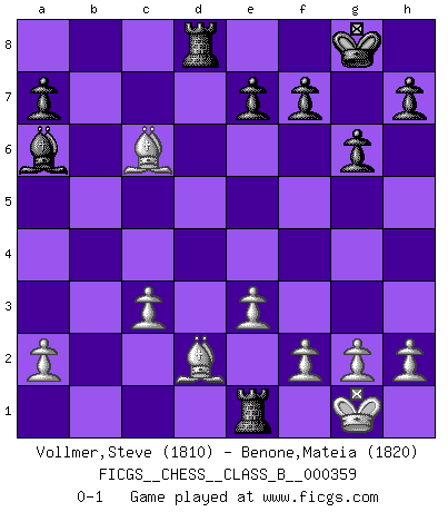 Last move : 0-1 2022 October 8 11:56:12 [Event "FICGS__CHESS__CLASS_B__000359"] [Site "FICGS"] [Date "2022.08.10"] [Round "1"] [White "Vollmer,Steve"] [Black "Benone,Mateia"] [Result "0-1"] [WhiteElo "1810"] [BlackElo "1820"] 1.Nf3 c5 2.c4 g6 3.Nc3 Bg7 4.d4 cxd4 5.Nxd4 Nc6 6.e3 Nf6 7.Be2 O-O 8.O-O d5 9.cxd5 Nxd5 10.Nxd5 Qxd5 11.Bf3 Qc5 12.Nxc6 bxc6 13.Qa4 Rd8 14.Qxc6 Qxc6 15.Bxc6 Rb8 16.Rb1 Ba6 17.Re1 Bc3 18.bxc3 Rxb1 19.Bd2 Rxe1+ 0-1 Follow this game move after move (download)Chess is imagination. (David Bronstein) Am wohlsten fühle ich mich, wenn ich sehe, wie sich mein Gegner im Todeskampf windet. (Robert James Fischer) Las leyes del Ajedrez no permiten una libre elección: tienes que mover quieras o no. (Emanuel Lasker) Une platitude souvent récitée à propos des Echecs est qu'une des choses les plus difficiles à réaliser est de gagner une position gagnante. Cela ne manque pas de sens mais, pour ma part, j'ai toujours trouvé plus difficile de gagner une position perdante. (Tim Krabbe) Fear is the path to the dark side. Fear leads to anger; anger leads to hate; hate leads to suffering. I sense much fear in you. (Master Yoda in Star Wars ep.1)