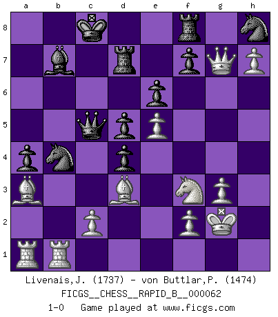 Last move : 1-0 2007 November 7 12:11:21 [Event "FICGS__CHESS__RAPID_B__000062"] [Site "FICGS"] [Date "2007.08.09"] [Round "1"] [White "Livenais,Jean-Rene"] [Black "von Buttlar,Paul"] [Result "1-0"] [WhiteElo "1737"] [BlackElo "1474"] 1.e4 e6 2.d4 d5 3.Nc3 Bb4 4.e5 c5 5.a3 Bxc3+ 6.bxc3 Ne7 7.Qg4 cxd4 8.Qxg7 Rg8 9.Qxh7 Nbc6 10.Nf3 Qa5 11.Rb1 Qxc3+ 12.Kd1 a6 13.h4 b5 14.h5 Rf8 15.h6 Ng6 16.Qg7 Bb7 17.h7 Nh8 18.Bb2 Qc5 19.Bd3 O-O-O 20.Ke1 b4 21.axb4 Qxb4+ 22.Kf1 a5 23.g3 Qc5 24.Kg2 a4 25.Ra1 Rd7 26.Ba3 Nb4 27.Rhb1 1-0 French : Winawer, Advance, poisoned pawn variation Queenside Castling by player Black (move 19) Player White won this chess game. Follow this game move after move (download)Half the variations which are calculated in a tournament game turn out to be completely superfluous. Unfortunately, no one knows in advance which half. (Jan Tinman) Der 70jährige Viktor Kortschnoi: Die Rentenanstalt wollte mich zwingen in Rente zu gehen. Meine Frau erhält jetzt eine Pension- und ich zahle weiter in die Rentenkasse ein! (Viktor Kortschnoi) Siempre es mejor sacrificar los hombres de tu oponente. (Savielly Tartakower) Pour moi, les échecs ne sont pas un jeu mais un art. (Alexandre Alekhine) Wisdom doesn't necessarily come with age. Sometimes age just shows up all by itself. (Tom Wilson)