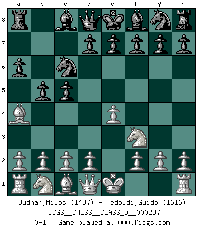Last move : 0-1 2022 August 21 12:27:24 [Event "FICGS__CHESS__CLASS_D__000287"] [Site "FICGS"] [Date "2022.08.12"] [Round "1"] [White "Budnar,Milos"] [Black "Tedoldi,Guido"] [Result "0-1"] [WhiteElo "1497"] [BlackElo "1616"] 1.e4 c5 2.Nf3 Nc6 3.Bb5 a6 4.Ba4 b5 0-1 Follow this game move after move (download)When your house is on fire, you can't be bothered with the neighbors. Or, as we say in Chess, if your King is under attack you don't worry about losing a Pawn on the Queen's side. (Gary Kasparov) Wer nie einen Fehler gemacht hat, hat nie etwas Neues ausprobiert. (Albert Einstein) El Ajedrez es un juego de pelea el cual es puramente intelectual e incluye la suerte. (Richard Reti) Pour moi, les échecs ne sont pas un jeu mais un art. (Alexandre Alekhine) The man who strikes first admits that his ideas have given out. (Chinese proverb)