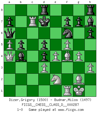Last move : 1-0 2022 September 14 16:45:35 [Event "FICGS__CHESS__CLASS_D__000287"] [Site "FICGS"] [Date "2022.08.12"] [Round "1"] [White "Dizer,Grigory"] [Black "Budnar,Milos"] [Result "1-0"] [WhiteElo "1500"] [BlackElo "1497"] 1.e4 e5 2.Nc3 Nf6 3.Nf3 Nc6 4.g3 d6 5.Bg2 Bg4 6.h3 Bh5 7.g4 Bg6 8.d3 Nd4 9.Nxd4 exd4 10.Ne2 c5 11.f4 h6 12.O-O Qb6 13.f5 Bh7 14.c3 O-O-O 15.cxd4 cxd4 16.a4 d5 17.a5 Qa6 18.Bf4 Bc5 19.b4 Bxb4 20.Rc1+ Kd7 21.Qa4+ b5 22.Rc7+ 1-0 Follow this game move after move (download)The laws of Chess do not permit a free choice: you have to move whether you like it or not. (Emanuel Lasker) Moralische Siege zählen nicht. (Savielly Grigorievitsch Tartakower) Cuando me preguntan: -¿Cual es el secreto que te hace hacer mejores movidas que tus oponentes?, Yo respondo: Me da gusto que me pregunten eso, porque, como veran, hay una simple razón. Yo pienso mis propias movidas y dejo a mi oponente que el piense las suyas. (Alexander Alekhine) Les sacrifices démontrent seulement que quelqu'un a gaffé. (Savielly Tartacover) The human is the only animal species whose members are able to talk themselves into difficulties that would not otherwise exist. (Wendell Johnson)
