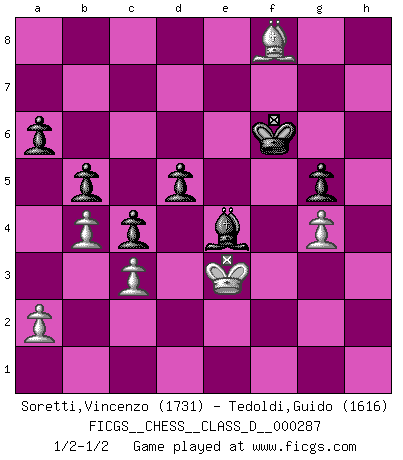 Last move : 1/2-1/2 2023 January 27 10:35:59 [Event "FICGS__CHESS__CLASS_D__000287"] [Site "FICGS"] [Date "2022.08.12"] [Round "1"] [White "Soretti,Vincenzo"] [Black "Tedoldi,Guido"] [Result "1/2-1/2"] [WhiteElo "1731"] [BlackElo "1616"] 1.e4 c5 2.Nf3 Nc6 3.Bb5 a6 4.Be2 d6 5.O-O e5 6.c3 Nf6 7.d3 h6 8.h3 Be7 9.Nbd2 b5 10.b3 O-O 11.Re1 Nh7 12.Nf1 f5 13.exf5 Bxf5 14.Ng3 Bg6 15.Bd2 Bh4 16.Nxh4 Qxh4 17.Bf3 Rac8 18.Qe2 Ne7 19.Kh2 Nf6 20.Bb7 Rb8 21.Bf3 Nf5 22.Nxf5 Bxf5 23.Rh1 Rbe8 24.Kg1 e4 25.g3 exf3 26.Qxe8 Qxg3+ 27.fxg3 Rxe8 28.Re1 Rxe1+ 29.Bxe1 Bxd3 30.Kf2 Be4 31.Bd2 d5 32.Bf4 Kf7 33.Rd1 g5 34.Be3 c4 35.b4 Ke6 36.g4 Nd7 37.Bd4 Ne5 38.Rd2 Ng6 39.Bg7 Nf4 40.Bxh6 Nxh3+ 41.Kg3 f2 42.Rd1 Bd3 43.Kxh3 f1Q+ 44.Rxf1 Bxf1+ 45.Kg3 Kf6 46.Kf3 Bd3 47.Ke3 Be4 48.Kf2 Bc2 49.Ke3 Be4 50.Bf8 1/2-1/2 Follow this game move after move (download)The most powerful weapon in Chess is to have the next move. (David Bronstein) Privat ist Kortschnoi kein schlechter Mensch, sehr sympathisch. Aber während des Spiels ist er grausam. Er will dich töten. (Miguel Najdorf) El tablero es el mundo, las piezas es el fenomeno del universo, las reglas del juego son lo que llamamos leyes de la naturaleza y el jugador del lado opuesto, se encuentra oculto a nuestra vista. (Thomas Huxley) Même si vous avez un bon coup à faire, regardez toujours s'il n'y en a pas un qui lui soit préférable. (Pedro Damiano) Somehow our devils are never quite what we expect when we meet them face to face. (Nelson DeMille)