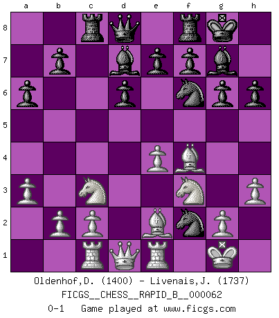 Last move : 0-1 2007 November 9 6:59:17 [Event "FICGS__CHESS__RAPID_B__000062"] [Site "FICGS"] [Date "2007.08.09"] [Round "1"] [White "Oldenhof,Dwight"] [Black "Livenais,Jean-Rene"] [Result "0-1"] [WhiteElo "1400"] [BlackElo "1737"] 1.e4 c5 2.Nf3 g6 3.d4 cxd4 4.Qxd4 Nf6 5.Nc3 Nc6 6.Qd1 Bg7 7.Be2 O-O 8.O-O d6 9.Re1 a6 10.a3 Be6 11.Ng5 Bd7 12.Rb1 Rc8 13.Bf4 Ne5 14.Rc1 h6 15.Nf3 Neg4 16.h3 Nxf2 0-1 This chess game has been lost on time (started : 2007.08.09 6:54:57) Sicilian : Hungarian variation Kingside Castling by player Black (move 7) Kingside Castling by player White (move 8) Player Black won this chess game. Follow this game move after move (download)Modern Chess is too much concerned with things like Pawn structure. Forget it, Checkmate ends the game. (Nigel Short) Ein bischen Romantik kann weder im Schach noch in der Liebe schaden. Also versuche ich mich ab und zu daran zu erinnern. (Nigel Short) Durante una competencia de Ajedrez, un Maestro de Ajedrez deberá ser una combinación de presa de caza y un Monge. (Alexander Alekhine) Le génie consiste à savoir transgresser les règles au moment opportun. (Teichmann) Lamb in skin of tiger, still fears the wolf. (Chinese proverb)