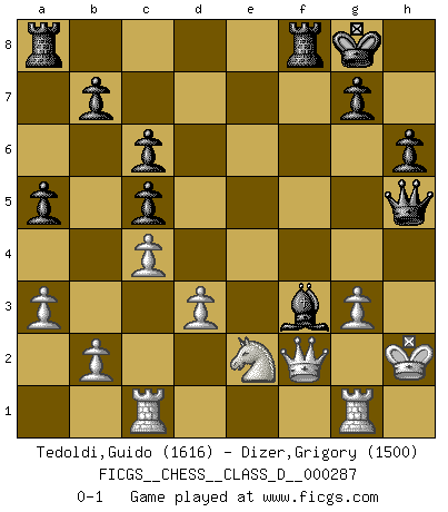 Last move : 0-1 2022 November 29 10:40:50 [Event "FICGS__CHESS__CLASS_D__000287"] [Site "FICGS"] [Date "2022.08.12"] [Round "1"] [White "Tedoldi,Guido"] [Black "Dizer,Grigory"] [Result "0-1"] [WhiteElo "1616"] [BlackElo "1500"] 1.c4 e5 2.Nc3 Nc6 3.Nf3 Be7 4.d3 Nf6 5.e4 O-O 6.Bd2 Bc5 7.h3 d6 8.Be2 h6 9.a3 Nd4 10.Nb5 Ne6 11.Rc1 c6 12.Nc3 a5 13.O-O Nh5 14.Be3 Nhf4 15.Bxc5 dxc5 16.Nxe5 Qg5 17.Ng4 f5 18.exf5 Nd4 19.Kh1 Bxf5 20.Rg1 Ndxe2 21.Nxe2 Bxg4 22.g3 Bf3+ 23.Kh2 Nxh3 24.Qf1 Nxf2 25.Qxf2 Qh5+ 0-1 Follow this game move after move (download)I am the best player in the world and I am here to prove it. (Bobby Fischer) Die Neutralität betrachte ich als eine schwere Krankheit. (Viktor Kortschnoi) La única cosa que los jugadores de Ajedrez tienen en común, es el Ajedrez. (Lodewijk Prins) Avant la finale, les dieux ont créé le milieu de partie. (Tarrasch) A good book on your shelf is a friend that turns its back on you and remains a friend. (Author unknown)