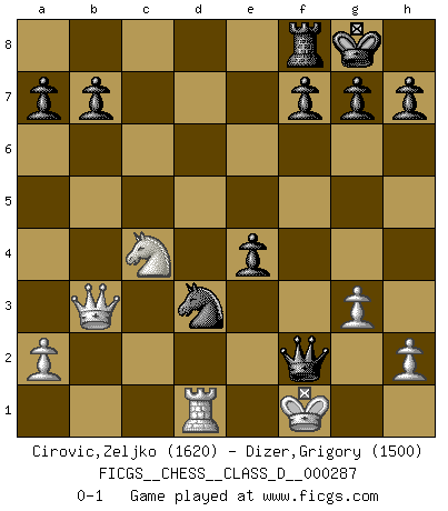 Last move : 0-1 2022 October 18 11:12:20 [Event "FICGS__CHESS__CLASS_D__000287"] [Site "FICGS"] [Date "2022.08.12"] [Round "1"] [White "Cirovic,Zeljko"] [Black "Dizer,Grigory"] [Result "0-1"] [WhiteElo "1620"] [BlackElo "1500"] 1.e4 e5 2.Nf3 Nc6 3.c3 Be7 4.d4 Nf6 5.dxe5 Nxe4 6.Bd3 d5 7.Bf4 O-O 8.Bxe4 dxe4 9.Nd4 Bg5 10.Bxg5 Qxg5 11.O-O Bh3 12.g3 Bxf1 13.Kxf1 Rad8 14.Na3 Nxe5 15.b4 Nd3 16.Nc4 c5 17.bxc5 Qxc5 18.Qb3 Rxd4 19.cxd4 Qxd4 20.Rd1 Qxf2+ 0-1 Follow this game move after move (download)Chess is mental torture. (Garry Kasparov) Pläne sind die Träume des Verständigen. (Ernst Freiherr von Feuchtersleben) Haz el enroque temprano y seguido. (Rob Sillars) Ce qui est bien, c'est d'avoir tout un tas de pièces en prise : l'adversaire ne peut en prendre qu'une à la fois. Cité par Thierry Audin. I don't diet. I just don't eat as much as I'd like to. (Linda Evangelista, supermodel)