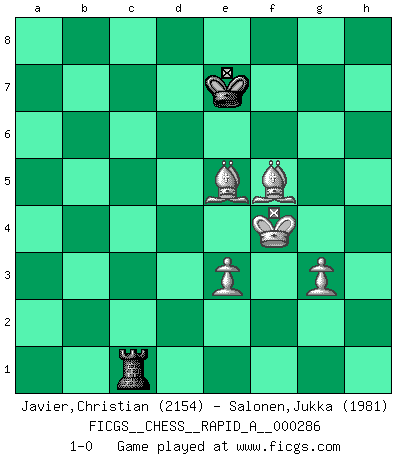 Last move : 1-0 2023 January 20 10:25:58 [Event "FICGS__CHESS__RAPID_A__000286"] [Site "FICGS"] [Date "2022.08.14"] [Round "1"] [White "Javier,Christian"] [Black "Salonen,Jukka"] [Result "1-0"] [WhiteElo "2154"] [BlackElo "1981"] 1.Nf3 Nf6 2.d4 d5 3.c4 e6 4.g3 dxc4 5.Bg2 c5 6.O-O Nc6 7.dxc5 Qxd1 8.Rxd1 Bxc5 9.Nbd2 Ng4 10.Ne4 Be7 11.Nd6+ Bxd6 12.Rxd6 Ke7 13.Rd1 e5 14.b3 f5 15.Ba3+ Kf6 16.h3 Nh6 17.Rd6+ Be6 18.Ng5 Kxg5 19.Bxc6 Kf6 20.Bxb7 Nf7 21.Ra6 Rab8 22.Rxa7 cxb3 23.axb3 Nd8 24.Bg2 Re8 25.f4 Rxb3 26.fxe5+ Kxe5 27.Be7 Nb7 28.Rxb7 Rxb7 29.Ra5+ Bd5 30.Rxd5+ Ke6 31.Ba3 Rd7 32.Rb5 Red8 33.Kf2 g6 34.Bc1 Ra7 35.Bf4 Rd1 36.Rb6+ Kf7 37.h4 Rd8 38.Rb5 Kg7 39.Be5+ Kf8 40.Bb8 Ra6 41.Bd5 Rd7 42.Bb3 Ke8 43.Bf4 R6a7 44.Bc4 Rab7 45.h5 Re7 46.Bg5 Rec7 47.hxg6 hxg6 48.Re5+ Kd7 49.Bf7 Kd6 50.Re6+ Kd5 51.Re7 Kd6 52.Rxc7 Kxc7 53.Bxg6 Rb5 54.Bf6 Kd6 55.Bd4 Ke6 56.Bh7 Rb7 57.Bg8+ Kd6 58.Ba2 Rc7 59.Bb1 Ke6 60.e3 Rc1 61.Bd3 Rd1 62.Bc4+ Kd6 63.Kf3 Rd2 64.Bg7 Ke7 65.Be5 Rh2 66.Bd3 Ke6 67.Bc3 Rh6 68.Bc4+ Ke7 69.Kf4 Rg6 70.Be2 Rg8 71.Bb4+ Kd7 72.Bb5+ Kd8 73.Be2 Kd7 74.Bc3 Ke7 75.Be5 Rd8 76.Bc4 Rc8 77.Bd3 Rc1 78.Bxf5 1-0 Follow this game move after move (download)It's always better to sacrifice your opponent's men. (Savielly Tartakover) Du musst Deinen Gegner in einen tiefen dunklen Wald führen wo 2+2=5 ist und wo der Weg, der wieder hinausführt, nur breit genug für einen ist. (Mikhail Nekhemyevich Tal) Sin errores no puede haber brillantez. (Emanuel Lasker) Mais l'homme est une créature légère et illogique : semblable au joueur d'échecs, il n'aime que le processus du but à atteindre, non le but lui-même. (Dostoïevsky) A generalist learns less and less about more and more until he knows nothing about everything. (Author unknown)