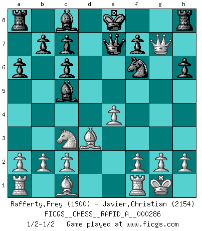 Last move : 1/2-1/2 2022 September 12 8:53:12 [Event "FICGS__CHESS__RAPID_A__000286"] [Site "FICGS"] [Date "2022.08.14"] [Round "1"] [White "Rafferty,Frey"] [Black "Javier,Christian"] [Result "1/2-1/2"] [WhiteElo "1900"] [BlackElo "2154"] 1.e4 e5 2.Nf3 Nc6 3.d4 exd4 4.Nxd4 Bc5 5.Nxc6 Qf6 6.Qd2 dxc6 7.Nc3 Qe7 8.Bd3 Nf6 9.O-O a6 10.Qg5 h6 11.Qxg7 1/2-1/2 Follow this game move after move (download)By playing at Chess then, we may learn: First: Foresight... Second: Circumspection... Third: Caution... And lastly, we learn by Chess the habit of not being discouraged by present bad appearances in the state of our affairs, the habit of hoping for a favorable chance, and that of persevering in the secrets of resources. (Benjamin Franklin) Der Knackpunkt bei der Konzentration ist, daß wir nur durch sie etwas Neues und Ungewöhnliches am Schachbrett finden können. Sie ist der einzige Weg durch neue neue Ideen eine Überraschung zu bereiten. (Garry Kasparov) La estratégia requiere pensar, la táctica requiere observación. (Max Euwe) La victoire dans une partie d'Echecs appartient la plupart du temps à celui qui voit un peu plus loin que l'adversaire. (Lasker) Go and wake up your luck. (Persian saying)