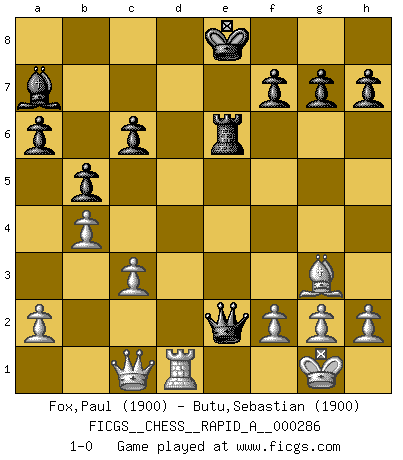 Last move : 1-0 2022 November 1 1:20:15 [Event "FICGS__CHESS__RAPID_A__000286"] [Site "FICGS"] [Date "2022.08.14"] [Round "1"] [White "Fox,Paul"] [Black "Butu,Sebastian"] [Result "1-0"] [WhiteElo "1900"] [BlackElo "1900"] 1.e4 e5 2.Nf3 Nc6 3.Bb5 Nf6 4.O-O Nxe4 5.Re1 Nd6 6.Nxe5 Be7 7.Nxc6 dxc6 8.Bf1 Be6 9.c3 Nf5 10.d4 c5 11.Qa4+ c6 12.dxc5 Bxc5 13.Qc2 Qf6 14.Bf4 O-O-O 15.b4 Bb6 16.Na3 Nh4 17.Bg3 Nf5 18.Bf4 a6 19.Bc4 Rhe8 20.Bxe6+ Rxe6 21.Nc4 Ba7 22.Be5 Qg5 23.Rad1 b5 24.Rxd8+ Kxd8 25.Rd1+ Ke8 26.Nd6+ Nxd6 27.Bxd6 Qg4 28.Bg3 Qe2 29.Qc1 1-0 This chess game has been lost on time (started : 2022.08.14 16:12:23) Follow this game move after move (download)Chess is a matter of delicate judgment, knowing when to punch and how to duck. (Bobby Fischer) Es war undenkbar für die Behörden, dass ein sowjetischer Großmeister auf diese Art und Weise [Fischer-Taimanov 6:0] verliert, ohne dass es eine politischer Erklärung dafür gäbe. (Mark Taimanov) Yo considero que Fischer es uno de los expertos mas grandes de aperturas de siempre. (Keith Hayward) Je menace de comprendre la position. (Anonyme) Over-the-board chess is the favorite of mortals, correspondence chess is the favorite of the gods. (Eduard Dyckhoff)