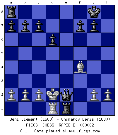 Last move : 0-1 2007 October 1 3:47:27 [Event "FICGS__CHESS__RAPID_B__000062"] [Site "FICGS"] [Date "2007.08.09"] [Round "1"] [White "Beni,Clement"] [Black "Chumakov,Denis"] [Result "0-1"] [WhiteElo "1600"] [BlackElo "1600"] 1.e4 e5 2.d4 exd4 3.Qxd4 Nc6 4.Qd3 Nf6 5.Nf3 d6 6.Bf4 Be7 7.Nc3 O-O 8.O-O-O Re8 9.Nd5 Bd7 10.Qd2 Nxe4 11.Qd3 Nxf2 12.Nxe7+ Qxe7 13.Qxh7+ Kxh7 14.Bd3+ Kg8 15.Bg5 Qf8 16.Rhf1 Nxd1 17.Rxd1 Ne5 18.Nxe5 Rxe5 19.Bf4 Re7 20.Bd2 Bg4 21.Rf1 Be2 22.Bxe2 Rxe2 23.Bf4 Qe7 24.Rd1 Re1 25.Kd2 Qe2+ 0-1 Centre game Kingside Castling by player Black (move 7) Queenside Castling by player White (move 8) Player Black won this chess game. Follow this game move after move (download)When you absolutely don't know what to do anymore, it is time to panic. (John van der Wiel) Der Vorposten provoziert a) eine Basis für neue Angriffe und b) eine Schwächung der gegnerischen Widerstandskraft in der fraglichen Linie. (Aaron Nimzowitsch) Yo jugué Ajedrez con el y a veces le pude haber ganado solo que siempre devuelve su última jugada y juega la partida de manera diferente. (Mark Twain) Il n'y a plus de joueurs du niveau de Jacob Murray dont la seule quête est le beau jeu, le plaisir de voir les pièces construire quelque chose. Sur 10 idées à la minute, 9 seront sans intérêt, la dernière s'avèrera géniale. (Christian Bauer) No enterprise is more likely to succeed than one concealed from the enemy until it is ripe for execution. (Niccolo Machiavelli)