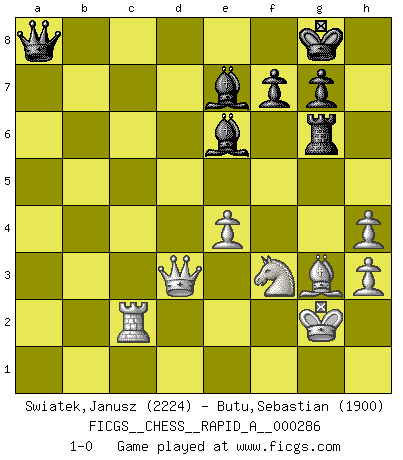 Last move : 1-0 2022 November 28 12:11:58 [Event "FICGS__CHESS__RAPID_A__000286"] [Site "FICGS"] [Date "2022.08.14"] [Round "1"] [White "Swiatek,Janusz"] [Black "Butu,Sebastian"] [Result "1-0"] [WhiteElo "2224"] [BlackElo "1900"] 1.d4 d5 2.c4 e6 3.Nf3 Nf6 4.g3 Bb4+ 5.Bd2 Be7 6.Bg2 c6 7.Bc3 dxc4 8.Ne5 a5 9.O-O b5 10.Nxc6 Nxc6 11.Bxc6+ Bd7 12.Bxa8 Qxa8 13.f3 Nd5 14.Bd2 e5 15.e4 Nb4 16.a4 Qa7 17.Bc3 O-O 18.axb5 Bh3 19.Rf2 Nd3 20.Rxa5 Qc7 21.Na3 exd4 22.b6 Qd8 23.Be1 Be6 24.Ra4 Qxb6 25.Nxc4 Qb5 26.Qxd3 Qxa4 27.Rc2 Rb8 28.Kg2 Rb3 29.Qxd4 Rxf3 30.Rc3 Rf6 31.Qd3 Qa1 32.Bf2 h5 33.Rc2 h4 34.gxh4 Qa6 35.Ne5 Qa8 36.b4 Bxb4 37.Nf3 Be7 38.Bg3 Rg6 39.h3 1-0 This chess game has been lost on time (started : 2022.08.14 16:12:23) Follow this game move after move (download)When I have White, I win because I am white; When I have Black, I win because I am Bogolyubov. (Bogolyubov) Schach ist ein schwarz-weisser Dschungel. (Garry Kasparov) Tu cuerpo tiene que estar en óptima condición. Tu Ajedrez se deteriora como lo hace tu cuerpo. No puedes separar la mente y el cuerpo. (Bobby Fischer) Il a essayé de se convaincre qu'il pourrait empêcher toutes les erreurs et ne jamais perdre. L'horreur ! Gary Kasparov au sujet de Robert Fischer. Don't be discouraged. It's often the last key in the bunch that opens the lock. (Author unknown)