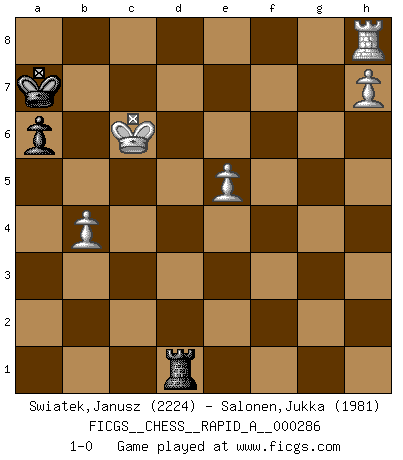 Last move : 1-0 2022 November 20 8:59:31 [Event "FICGS__CHESS__RAPID_A__000286"] [Site "FICGS"] [Date "2022.08.14"] [Round "1"] [White "Swiatek,Janusz"] [Black "Salonen,Jukka"] [Result "1-0"] [WhiteElo "2224"] [BlackElo "1981"] 1.d4 Nf6 2.c4 e6 3.g3 d5 4.Bg2 dxc4 5.Nf3 c5 6.O-O Nc6 7.Qa4 Bd7 8.Qxc4 cxd4 9.Nxd4 Na5 10.Qd3 Be7 11.Rd1 Rc8 12.Nb5 a6 13.Nd6+ Bxd6 14.Qxd6 Bc6 15.Qxd8+ Rxd8 16.Rxd8+ Kxd8 17.Bf1 e5 18.b3 b5 19.Bd2 Nb7 20.Na3 Ne4 21.Rc1 Kd7 22.Bh3+ Kd6 23.Bg2 f5 24.f4 Nd8 25.Bb4+ Kd7 26.fxe5 Bd5 27.Nc2 Nc6 28.Ba3 Nc3 29.Bxd5 Nxd5 30.Ne1 b4 31.Bb2 Nc3 32.Bxc3 bxc3 33.Rxc3 Nxe5 34.Nd3 Nxd3 35.Rxd3+ Ke6 36.Rc3 Kd6 37.Rc4 g6 38.Ra4 Ra8 39.Ra5 Kc6 40.Kf2 Kb6 41.Re5 Ra7 42.h4 Rd7 43.h5 Rd2 44.h6 Rxa2 45.Re7 Ra1 46.Rxh7 Rh1 47.Kg2 Rh5 48.Rh8 g5 49.h7 Kb7 50.g4 fxg4 51.b4 Rh6 52.Kg3 Rh1 53.Kxg4 Rg1+ 54.Kh5 Rh1+ 55.Kxg5 Rg1+ 56.Kf5 Rf1+ 57.Ke5 Rh1 58.e4 Ka7 59.Ke6 Rh2 60.e5 Rh1 61.Kd6 Rd1+ 62.Kc6 1-0 Follow this game move after move (download)In Fischer's hands, a slight theoretical advantage is as good a being a Queen ahead. (Isaac Kashdan) Der Umstand, daß uns eine 7 Stunden Zeitkontrolle ermöglicht eine großartige, tiefe Partie zu spielen, ist für die Massenmedien nicht weiter von Bedeutung. (Alexej Shirov) Al jugar al Ajedrez entonces, podemos aprender: Primero: Previsión... Segundo: Prudencia... Tercero: Cautela... Y al final, aprendemos del Ajedrez el hábito de no ser desanimados por apariencias malas presentes en el estado de nuestros asuntos, el hábito de la esperanza por una oportunidad favorable y la perseveración de los secretos de los recursos. (Benjamin Franklin) Le temps de noter son nom sur la feuille de partie, j'étais déjà en zeitnot ! D'un modeste amateur apparié lors de la première ronde d'un open contre le grand-maître Azmaïparashvili. The real danger is not that computers will begin to think like men, but that men will begin to think like computers. (Sydney J. Harris)
