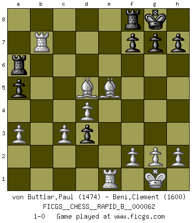 Last move : 1-0 2007 August 19 13:18:35 [Event "FICGS__CHESS__RAPID_B__000062"] [Site "FICGS"] [Date "2007.08.09"] [Round "1"] [White "von Buttlar,Paul"] [Black "Beni,Clement"] [Result "1-0"] [WhiteElo "1474"] [BlackElo "1600"] 1.c4 e5 2.Nc3 Nf6 3.Nf3 d5 4.cxd5 Nxd5 5.Nxe5 Nc6 6.Nxc6 bxc6 7.e4 Bb4 8.exd5 O-O 9.Be2 cxd5 10.d4 Bb7 11.O-O Qe7 12.Bf4 c5 13.a3 Bxc3 14.bxc3 a5 15.Bf3 c4 16.Re1 Qf6 17.Be5 Qf5 18.Rb1 Qd3 19.Qxd3 cxd3 20.Rxb7 Ra6 21.Bxd5 1-0 English Opening Kingside Castling by player Black (move 8) Kingside Castling by player White (move 11) Player White won this chess game. Follow this game move after move (download)You are for me the Queen on d8 and I am the Pawn on d7 !! (Eduard Gufeld) Der Knackpunkt bei der Konzentration ist, daß wir nur durch sie etwas Neues und Ungewöhnliches am Schachbrett finden können. Sie ist der einzige Weg durch neue neue Ideen eine Überraschung zu bereiten. (Garry Kasparov) Si tu oponente te ofrece un empate, trata de averiguar porque piensa él que esta en una posición peor. (Nigel Short) Un millionnaire : 'Monsieur Steinitz ! Vous ne participez aux tournois que pour l'argent, alors que moi je n'y viens que pour l'honneur.' Steinitz : 'Chacun joue pour ce qu'il n'a pas'... If you work for a living, why do you kill yourself working ? (Tuco to a chicken in The Good, The Bad and The Ugly)