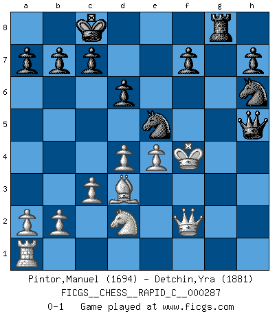 Last move : 0-1 2022 August 26 17:44:16 [Event "FICGS__CHESS__RAPID_C__000287"] [Site "FICGS"] [Date "2022.08.14"] [Round "1"] [White "Pintor,Manuel"] [Black "Detchin,Yra"] [Result "0-1"] [WhiteElo "1694"] [BlackElo "1881"] 1.e4 e5 2.f4 exf4 3.Nf3 g5 4.d4 d6 5.Bc4 g4 6.O-O gxf3 7.Qxf3 Qf6 8.c3 Bh6 9.Qh5 Qg6 10.Qf3 Be6 11.Bd3 Bg4 12.Qf2 f3 13.Bxh6 fxg2 14.Re1 Nxh6 15.Re3 Qg5 16.Nd2 Nd7 17.h3 O-O-O 18.Rg3 Qh5 19.Kxg2 Bxh3+ 20.Rxh3 Rhg8+ 21.Rg3 Rxg3+ 22.Kxg3 Rg8+ 23.Kf4 Ne5 0-1 Follow this game move after move (download)On the chessboard, lies and hypocrisy do not survive long. (Emanuel Lasker) Das Blackmar-Diemer-Gambit verändert den ganzen Menschen! (Emil Joseph Diemer) Cualquier cambio de material en una posición debe venir por medio de un mate, una captura o promoción de Peón. (Purdy) Pour moi, les échecs ne sont pas un jeu mais un art. (Alexandre Alekhine) Tree pose grows confidence. It roots me to this world. (Terri Guillemets)