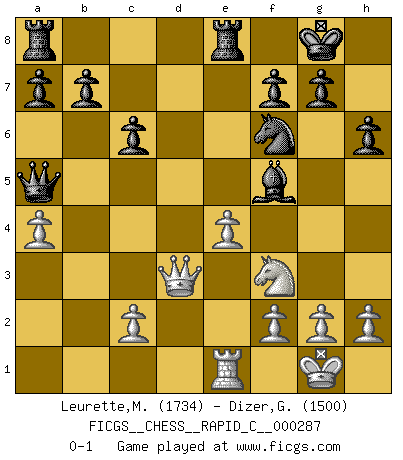 Last move : 0-1 2022 September 11 18:25:38 [Event "FICGS__CHESS__RAPID_C__000287"] [Site "FICGS"] [Date "2022.08.14"] [Round "1"] [White "Leurette,Marc-Antoine"] [Black "Dizer,Grigory"] [Result "0-1"] [WhiteElo "1734"] [BlackElo "1500"] 1.e4 e5 2.Nf3 Nc6 3.Bc4 Be7 4.Nc3 Nf6 5.Ng5 O-O 6.d3 Na5 7.b3 h6 8.Nf3 c6 9.a4 d5 10.b4 Bxb4 11.Bd2 dxc4 12.Nxe5 Re8 13.Nf3 cxd3 14.O-O Nc4 15.Re1 Nxd2 16.Qxd2 Qa5 17.Rac1 Bxc3 18.Qxd3 Bxe1 19.Rxe1 Bf5 0-1 Follow this game move after move (download)Chess is a foolish expedient for making idle people believe they are doing something very clever when they are only wasting their time. (George Bernard Shaw) Wer wird heute Abend ihr Gegner sein? -- Heute Abend spiele ich gegen die schwarzen Steine. (Akiba Rubinstein) El Ajedrez es como la guerra en un tablero. (Bobby Fischer) La vie et les Echecs sont tous les deux une lutte constante. (Lasker) Nowadays, anyone who cannot speak English and is incapable of using the Internet is regarded as backward. (Al-Waleed bin Talal)