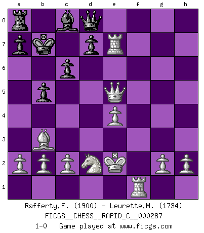Last move : 1-0 2022 August 25 14:16:5 [Event "FICGS__CHESS__RAPID_C__000287"] [Site "FICGS"] [Date "2022.08.14"] [Round "1"] [White "Rafferty,Frey"] [Black "Leurette,Marc-Antoine"] [Result "1-0"] [WhiteElo "1900"] [BlackElo "1734"] 1.e4 e5 2.Nf3 Nc6 3.Bc4 Nf6 4.Ng5 Bc5 5.Nxf7 Bxf2+ 6.Kf1 Qe7 7.Nxh8 Nxe4 8.Qh5+ g6 9.Nxg6 hxg6 10.Qxg6+ Kd8 11.d3 Qf8 12.dxe4 Be3 13.Ke2 Bxc1 14.Rxc1 Ne7 15.Qg5 c6 16.Rf1 Qh8 17.Rf7 Qe8 18.Nd2 b5 19.Raf1 Kc7 20.Qxe5+ Kb7 21.Rxe7 Qd8 22.Bb3 1-0 Follow this game move after move (download)Via the squares on the chessboard, the Indians explain the movement of time and the age, the higher influences which control the world and the ties which link Chess with the human soul. (Al-Masudi) Ein Großmeister muß tausende Partien in seinem Kopf speichern, denn diese sind für Ihn, was die Worte der Muttersprache für gewöhnliche Leute sind, oder Noten für Musiker... (Garry Kasparov) El Ajedrez moderno está demasiado preocupado con cosas como la estructura de Peones. Olvidenlo, el Jaque Mate termina la partida. (Nigel Short) Les Echecs représentent une sphère d'idées créatrices basée sur la volonté des deux protagonistes. (Smyslov) It is not titles that honor men, but men that honor titles. (Niccolo Machiavelli)