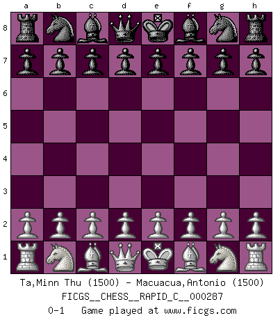 Last move : 0-1 2022 September 13 19:10:27 [Event "FICGS__CHESS__RAPID_C__000287"] [Site "FICGS"] [Date "2022.08.14"] [Round "1"] [White "Ta,Minn Thu"] [Black "Macuacua,Antonio"] [Result "0-1"] [WhiteElo "1500"] [BlackElo "1500"] 0-1 This chess game has been lost on time (started : 2022.08.14 16:17:13) Follow this game move after move (download)Chess is above all, a fight ! (Emanuel Lasker) Man kann eine Schachpartie nur gewinnen, wenn das Gleichgewicht gestört ist. In einer Stellung mit ungestörtem Gleichgewicht ist auch das größte Genie hilflos - in der Stellung steckt dann eben kein genialer Einfall. (Wilhelm Steinitz) A la fecha, Fischer esta simplemente un nivel arriba de todos los mejores jugadores de Ajedrez del mundo. (John Jacobs) Les Echecs ont trois composantes : le temps, l'espace et le matériel en dernier. (Mikhail Tal) We cannot be sure of having something to live for unless we are willing to die for it. (Ernesto Che Guevara)