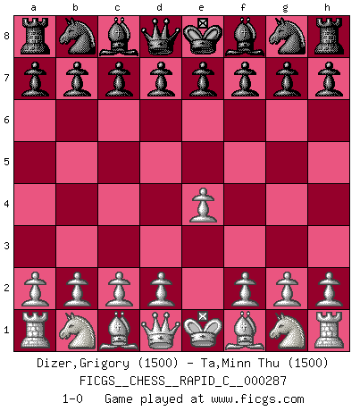 Last move : 1-0 2022 September 13 19:10:27 [Event "FICGS__CHESS__RAPID_C__000287"] [Site "FICGS"] [Date "2022.08.14"] [Round "1"] [White "Dizer,Grigory"] [Black "Ta,Minn Thu"] [Result "1-0"] [WhiteElo "1500"] [BlackElo "1500"] 1.e4 1-0 This chess game has been lost on time (started : 2022.08.14 16:17:13) Follow this game move after move (download)Chess is a fighting game which is purely intellectual and includes chance. (Richard Reti) Ich glaube nicht an Psychologie, ich glaube an gute Züge. (Robert James Fischer) Te sientas frente a un tablero y repentinamente tu corazón brinca. Tu mano tiembla al tomar una pieza y moverla. Pero lo que el Ajedrez te enseña es que tu debes permanecer ahí con calma y pensar de que si realmente es una buena idea o de que si hay otras ideas mejores. (Stanley Kubrick) Le système Elo représente seulement une moyenne. Il est simplement un indicateur de votre stabilité. (Anatoli Karpov) The quality of decision is like the well-timed swoop of a falcon which enables it to strike and destroy its victim. (Sun Tzu)