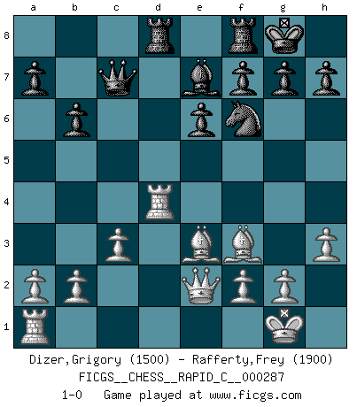 Last move : 1-0 2022 November 16 11:52:47 [Event "FICGS__CHESS__RAPID_C__000287"] [Site "FICGS"] [Date "2022.08.14"] [Round "1"] [White "Dizer,Grigory"] [Black "Rafferty,Frey"] [Result "1-0"] [WhiteElo "1500"] [BlackElo "1900"] 1.e4 c6 2.Nc3 d5 3.Nf3 Bg4 4.Be2 e6 5.d3 Nf6 6.h3 Bxf3 7.Bxf3 Nbd7 8.d4 dxe4 9.Nxe4 Nxe4 10.Bxe4 Be7 11.O-O O-O 12.Qd3 Nf6 13.Bf3 Qc7 14.Qe2 Rad8 15.Rd1 c5 16.Be3 b6 17.c3 cxd4 18.Rxd4 1-0 Follow this game move after move (download)We cannot resist the fascination of sacrifice, since a passion for sacrifices is part of a Chessplayer's nature. (Rudolf Spielman) Schach ist das Spiel, das die Verrückten gesund hält. (Albert Einstein) Alguna parte de un error es siempre correcto. (Savielly Tartakover) À la honte des hommes, on sait que les lois du jeu sont les seules qui soient partout justes, claires, inviolables et exécutées. Pourquoi l'Indien qui a donné les règles du jeu d'échecs est-il obéi de bon gré dans toute la terre, et que les décrétales des papes, par exemple, sont aujourd'hui un objet d'horreur et de mépris ? C'est que l'inventeur des échecs combina tout avec justesse pour la satisfaction des joueurs, et que les papes, dans leurs décrétales, n'eurent en vue que leur seul avantage. L'Indien voulut exercer également l'esprit des hommes et leur donner du plaisir; les papes ont voulu abrutir l'esprit des hommes. Voltaire (Dictionnaire philosophique / Garnier 1967) If only people were all showed a certain minimum level of niceness; if only people didn't retract verbal draw offers (without draw box ticked) on ficgs; if only people didn't kill; if only people didn't run concentration / extermination camps, if only people didn't drop nuclear bombs on Hiroshima and Nagasaki, and so on - it would be a much more beautiful world. But sadly, things are not so... (Normajean Yates)