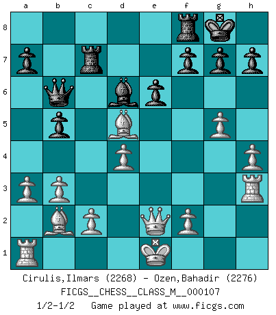 Last move : 1/2-1/2 2022 September 25 9:27:48 [Event "FICGS__CHESS__CLASS_M__000107"] [Site "FICGS"] [Date "2022.08.17"] [Round "1"] [White "Cirulis,Ilmars"] [Black "Ozen,Bahadir"] [Result "1/2-1/2"] [WhiteElo "2268"] [BlackElo "2276"] 1.e3 d5 2.Nf3 c5 3.b3 Nf6 4.Bb2 e6 5.d4 Nc6 6.Nbd2 cxd4 7.exd4 Bd6 8.a3 O-O 9.Bd3 b6 10.Ne5 Bb7 11.Qe2 Rc8 12.h4 b5 13.Rh3 Qb6 14.Nxc6 Rxc6 15.g4 Rc7 16.g5 Ne4 17.Nxe4 dxe4 18.Bxe4 Bd5 19.Bxd5 1/2-1/2 Follow this game move after move (download)The essence of Chess is thinking about what Chess is. (David Bronstein) Dass jemand wie Surab Asmaiparaschwili, der selbst Elopunkte gekauft hat , Vize-Präsident der Fide werden konnte, sagt schon einges über den Zustand dieser Organisation aus. (Joel Lautier) Una de estas pequeñas movidas modestas pudieran ser mas molestas a tu oponente que la amenaza mas grande. (Siegbert Tarrasch) Aidez vos pièces, elles vous aideront. (Paul Morphy) Programmer - an organism that turns coffee into software. (Anonymous)