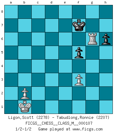 Last move : 1/2-1/2 2022 November 3 16:55:16 [Event "FICGS__CHESS__CLASS_M__000107"] [Site "FICGS"] [Date "2022.08.17"] [Round "1"] [White "Ligon,Scott"] [Black "Tabudlong,Ronnie"] [Result "1/2-1/2"] [WhiteElo "2278"] [BlackElo "2207"] 1.e4 c6 2.d4 d5 3.Nc3 dxe4 4.Nxe4 Bf5 5.Ng3 Bg6 6.h4 h6 7.Nf3 Nd7 8.h5 Bh7 9.Bd3 Bxd3 10.Qxd3 e6 11.Bd2 Ngf6 12.O-O-O Be7 13.Ne4 O-O 14.Nxf6+ Nxf6 15.Kb1 Qd5 16.c4 Qe4 17.Be3 Qxd3+ 18.Rxd3 Rfc8 19.Rb3 b6 20.Ne5 Rc7 21.f3 Rd8 22.Nd3 Nd7 23.c5 Nf6 24.Bf2 Nd5 25.a4 Bf6 26.g4 Rb7 27.Re1 Rdb8 28.Rc1 Ra8 29.Kc2 Kh7 30.Nb4 Ne7 31.Nd3 b5 32.Ra1 a5 33.axb5 cxb5 34.Nb4 Rd7 35.Nd3 Bxd4 36.Bxd4 Rxd4 37.Rxb5 Rad8 38.Rb7 Nc6 39.Rc7 Rxd3 40.Rxc6 Rd2+ 41.Kb1 Rb8 42.Rb6 Rxb6 43.cxb6 Rd6 44.Rxa5 Rxb6 45.Ra7 f5 46.gxf5 exf5 47.Ra5 g6 48.Ra7+ Kg8 49.hxg6 Rxg6 50.Ra8+ Kf7 51.Ra7+ Ke6 52.Ra6+ Kf7 53.Rxg6 1/2-1/2 Follow this game move after move (download)Chess is a terrific way for kids to build self image and self esteem. (Saudin Robovic) Wer mein Gambit spielt, muß bereit sein, alle Brücken hinter sich abzubrechen. Es verändert den ganzen Menschen. Es wirkt wie ein Zauberstab und fördert verkümmerte, gute Charakter- eigenschaften wieder zu Tage. (Emil Joseph Diemer) A la fecha, Fischer esta simplemente un nivel arriba de todos los mejores jugadores de Ajedrez del mundo. (John Jacobs) Aux échecs, les retours au sommet sont rares : les dommages psychologiques consécutifs à une défaite sont trop sévères. (Daily Telegraph) Every man's memory is his private literature. (Aldous Huxley)