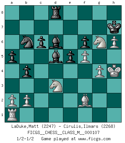 Last move : 1/2-1/2 2022 October 28 1:44:12 [Event "FICGS__CHESS__CLASS_M__000107"] [Site "FICGS"] [Date "2022.08.17"] [Round "1"] [White "LaDuke,Matt"] [Black "Cirulis,Ilmars"] [Result "1/2-1/2"] [WhiteElo "2247"] [BlackElo "2268"] 1.Nf3 d5 2.g3 h5 3.Bg2 h4 4.Nxh4 e5 5.c4 d4 6.d3 a5 7.O-O Nc6 8.e3 g5 9.Nf3 g4 10.Ne1 f6 11.exd4 Nxd4 12.Nc2 Nf3+ 13.Bxf3 gxf3 14.Qxf3 Qd7 15.Ne3 Qxd3 16.Nc3 Qh7 17.h4 c6 18.Bd2 Qg6 19.Qe4 Ne7 20.Qxg6+ Nxg6 21.Ng2 Bf5 22.Be3 Be7 23.f4 Bd3 24.Rf2 Bxc4 25.f5 Nf8 26.Kh2 b5 27.g4 Rd8 28.Kg3 Rg8 29.Rd2 Rxd2 30.Bxd2 Nd7 31.h5 Kf7 32.Nh4 Rd8 33.Ng6 Nb6 34.Be1 b4 35.Ne4 Bd5 36.Nf2 Bc5 37.Nd3 Bd6 38.h6 Kg8 39.Kh4 Kh7 40.Bf2 1/2-1/2 Follow this game move after move (download)Chess is a more highly symbolic game, but the aggressions are therefore even more frankly represented in the play. It probably began as a war game; that is, the representation of a miniature battle between the forces of two kingdoms. (Karl Meninger) Sie bekommen vielleicht den Eindruck, dass die Spitzenspieler überhaupt gar nicht so stark sind. Aber das stimmt nicht. Es ist eine Illusion. Mit einem Computer an der Seite ist es sehr leicht, Urteile zu fällen, aber wenn man alleine am Brett sitzt, sieht die Sache ganz anders aus. (Vladimir Kramnik) El Ajedrez es realmente noventa y nueve por ciento calculación. (Soltis) Vouloir jouer aux échecs contre soi-même est aussi paradoxal que vouloir marcher sur son ombre. (Stefan Zweig) Who needs drugs and alcohol if he can play Big Chess at FICGS ? (Heinz-Georg Lehnhoff)