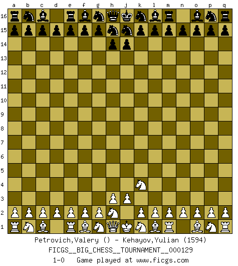 Last move : 1-0 2022 September 18 23:54:18 [Event "FICGS__BIG_CHESS__TOURNAMENT__000129"] [Site "FICGS"] [Date "2022.08.19"] [Round "1"] [White "Petrovich,Valery"] [Black "Kehayov,Yulian"] [Result "1-0"] [WhiteElo ""] [BlackElo "1594"] 1.j2-k4 1-0 This big chess game has been lost on time (started : 2022.08.19 9:34:19) Follow this game move after move (download)As one by one I mowed them down, my superiority soon became apparent. (Jose Capablanca) Ein Buch ist ein Spiegel; wenn ein Affe hineinsieht, so kann kein Apostel heraus gucken. (Georg Christoph Lichtenberg) Un Peón pasado aumenta su poder a medida de que el número de piezas en el tablero disminuye. (Capablanca) Le succès, c'est être capable d'aller d'échec en échec sans perdre son enthousiasme. (Winston Churchill) The difference between perseverance and obstinacy is that one comes from a strong will, and the other from a strong won't. (Henry Ward Beecher)