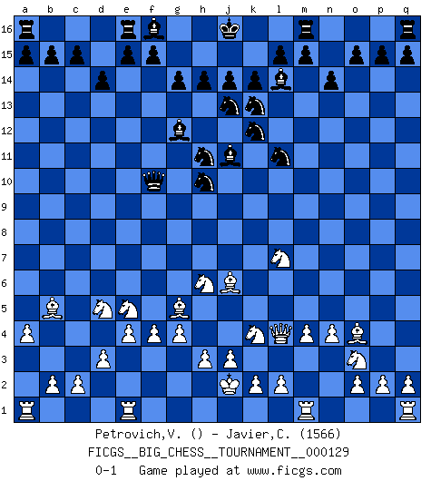 Last move : 0-1 2022 November 18 2:8:54 [Event "FICGS__BIG_CHESS__TOURNAMENT__000129"] [Site "FICGS"] [Date "2022.08.19"] [Round "1"] [White "Petrovich,Valery"] [Black "Javier,Christian"] [Result "0-1"] [WhiteElo ""] [BlackElo "1566"] 1.j2-k4 b16-c14 2.h2-g4 h15-g13 3.e2-e4 d15-d14 4.b1-c3 p16-o14 5.k1-l3 k16-l14 6.f1-b5 n15-n14 7.d2-d3 g16-f14 8.m2-m4 j15-k13 9.p1-o3 o14-m13 10.n2-n4 c16-g12 11.l1-p5 l14-j13 12.o1-j6 c14-e13 13.c1-h6 o16-k12 14.f2-f4 g15-g14 15.g1-f3 k15-k14 16.l3-m5 e13-f11 17.h1-l4 f11-h10 18.m5-l7 k12-j11 19.p5-o4 f14-h13 20.j1-j2 h16-b10 21.a2-a4 h13-k12 22.c3-d5 l16-k15 23.h6-g5 b10-f10 24.f3-e5 k15-l14 25.g4-h6 m13-l11 26.g2-g4 g13-h11 0-1 This big chess game has been lost on time (started : 2022.08.19 9:34:19) Follow this game move after move (download)By playing at Chess then, we may learn: First: Foresight... Second: Circumspection... Third: Caution... And lastly, we learn by Chess the habit of not being discouraged by present bad appearances in the state of our affairs, the habit of hoping for a favorable chance, and that of persevering in the secrets of resources. (Benjamin Franklin) Charakterschwächen offenbaren sich normalerweise während einer Schachpartie. (Garry Kasparov) Si el Ajedrez es una ciencia, es la mas inexacta. Si el Ajedrez es un arte, es demasiado inexacto para ser visto como tal. Si el Ajedrez es un deporte, es demasiado esotérico. Si el Ajedrez es un juego, es demasiado exigente para ser solo un juego. Si el Ajedrez es una aventura, es una muy demandante. Si el Ajedrez es una pasión, es una muy gratificante. Si el Ajedrez es la vida, es una muy triste. (Anónimo) Fischer est le meilleur joueur du monde et Karpov n'est qu'un joueur de bistrot. (Garry Kasparov, agé de 16 ans) There is a great deal of difference between an eager man who wants to read a book and a tired man who wants a book to read. (G.K. Chesterton)