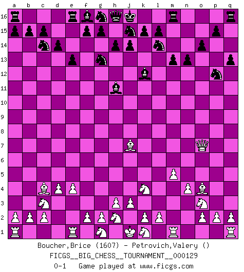 Last move : 0-1 2022 October 17 0:25:30 [Event "FICGS__BIG_CHESS__TOURNAMENT__000129"] [Site "FICGS"] [Date "2022.08.19"] [Round "1"] [White "Boucher,Brice"] [Black "Petrovich,Valery"] [Result "0-1"] [WhiteElo "1607"] [BlackElo ""] 1.j2-k4 h15-g13 2.h1-o7 p16-o14 3.m2-m4 m15-m13 4.n2-n4 k16-l14 5.e2-e4 l16-p12 6.d2-d4 e15-e13 7.b1-c3 n15-n13 8.l1-o4 d15-d14 9.o1-j6 b16-c14 10.j6-p12 o14-p12 11.m4-m5 o15-o14 12.f1-c4 c16-h11 13.p1-o3 q15-q13 14.c1-j7 o16-k12 0-1 This big chess game has been lost on time (started : 2022.08.19 9:34:19) Follow this game move after move (download)Alekhine is a poet who creates a work of art out of something that would hardly inspire another man to send home a picture post card. (Max Euwe) Ich verstehe mehr vom Schach als irgendein anderer lebender Meister. (José Raúl Capablanca) El jugador de combinación piensa hacia adelante; comienza de la posición dada y trabaja las movidas contundentes en su mente. (Emanuel Lasker) Tout change constamment, y compris dans le monde des Echecs. (Botvinnik) Nothing is more important for teaching us to understand the concepts we have than constructing fictitious ones. (Ludwig Wittgenstein)