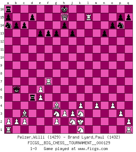 Last move : 1-0 2022 September 12 21:0:15 [Event "FICGS__BIG_CHESS__TOURNAMENT__000129"] [Site "FICGS"] [Date "2022.08.19"] [Round "1"] [White "Pelzer,Willi"] [Black "Brand Lyard,Paul"] [Result "1-0"] [WhiteElo "1429"] [BlackElo "1432"] 1.k2-k4 e15-e14 2.p2-p3 f16-d14 3.o1-p2 c15-c14 4.j2-g3 n15-n14 5.h1-o7 g15-g14 6.d2-d4 o15-o14 7.m2-m4 m15-m13 8.e2-e4 n14-n13 9.b1-c3 m16-m14 10.d4-d5 b15-b14 11.o2-o4 m14-l14 12.l2-l4 c16-a14 13.p1-o3 a14-l4 14.o7-f7 l4-n2 15.m1-n1 n2-o3 16.p2-o3 f15-f13 17.l1-k2 l16-o13 18.f7-m13 p16-n15 19.m13-m5 l14-m14 20.m5-g5 g14-g13 21.f1-e2 j15-g14 22.g5-d8 d14-f12 23.d8-l15 m14-l14 24.l15-d8 l14-l2 25.e2-h5 l2-k2 26.j1-k2 n15-p14 27.c1-m10 h16-f14 28.d8-o8 j14-j13 29.o8-o13 o16-b4 30.m10-d2 q16-m16 31.h2-k3 m16-m6 32.n1-l1 b4-c3 33.d2-c3 f12-a7 34.e1-e2 f14-a9 35.g1-j2 a7-b8 36.e4-e5 m6-e6 37.d5-e6 b8-a7 38.l1-l15 a7-f2 39.e2-f2 a9-a8 40.o3-q5 a8-a7 41.f2-f7 a7-b6 42.h5-g4 e14-e13 43.q5-g14 e16-e14 44.g14-f15 e14-d14 45.f15-g16 d14-d5 46.o13-l16 b16-a14 47.l16-k15 j16-h16 48.g16-h15 k16-h15 49.k15-h15 1-0 Follow this game move after move (download)You need not play well - just help your opponent to play badly. (Genrikh Chepukaitis) Smyslow ist ein Beweis dafür, dass ich noch zehn Jahre spielen kann! [der 75 jährige über den 85 jährigen] (Viktor Kortschnoi) El juego de Fischer siempre fue nítido, racional y brillante. Uno de los mejores por siempre. (Dave Regis) Les Echecs représentent une sphère d'idées créatrices basée sur la volonté des deux protagonistes. (Smyslov) It is not true that people stop pursuing dreams because they grow old, they grow old because they stop pursuing dreams. (Gabriel Garcia Marquez)
