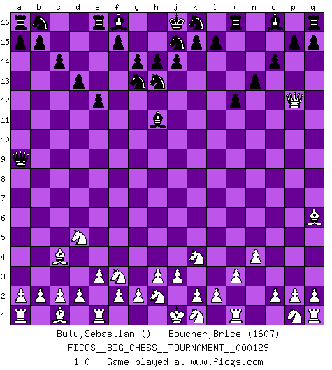 Last move : 1-0 2022 October 10 11:18:4 [Event "FICGS__BIG_CHESS__TOURNAMENT__000129"] [Site "FICGS"] [Date "2022.08.19"] [Round "1"] [White "Butu,Sebastian"] [Black "Boucher,Brice"] [Result "1-0"] [WhiteElo ""] [BlackElo "1607"] 1.j2-k4 m15-m13 2.n2-n4 h15-g13 3.o1-d11 g15-g14 4.m2-m3 e15-e13 5.l1-q6 d15-d13 6.b1-c3 e13-e12 7.d11-b13 c15-c14 8.b13-a12 n15-n13 9.e2-e3 g16-f14 10.g1-f3 m13-m12 11.h1-q9 f14-h13 12.q9-q13 h16-a9 13.a12-f7 o15-o14 14.f1-c4 p16-q14 15.f7-h5 c16-h11 16.c3-d5 l16-p12 17.h5-p12 q14-p12 18.q13-p12 1-0 This big chess game has been lost on time (started : 2022.08.19 9:34:19) Follow this game move after move (download)You can only get good at Chess if you love the game. (Bobby Fischer) Man braucht nicht immer den besten Zug zu spielen: Ein Zug muß aktiv, unternehmungslustig, korrekt und schön sein. (David Bronstein) El Ajedrez demanda una total concentración. (Bobby Fischer) Aux échecs, l'amour-propre est satisfait quand on remporte la victoire, mais il n'y a pas de honte à être battu. (Benjamin Franklin) Wisdom begins at the end. (Daniel Webster)